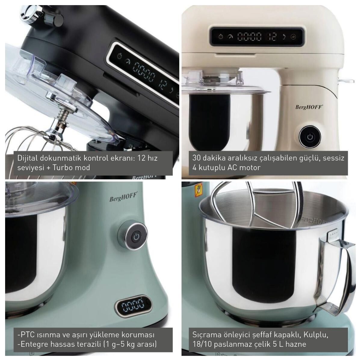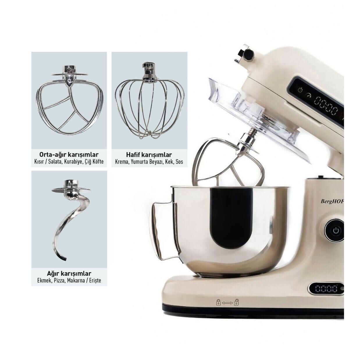 Profesyonel performans mutfağınızda! 1600W güçlü AC motoru ve entegre dijital terazisi ile Berghoff Stand Mikser, kusursuz sonuçlar için tasarlandı. Hamurdan kek karışımına kadar her aşamada ideal kıvamı yakalamanıza yardımcı olur. Dokunmatik ekranıyla hız, süre ve turbo fonksiyonlarını zahmetsizce kontrol edebilirsiniz.