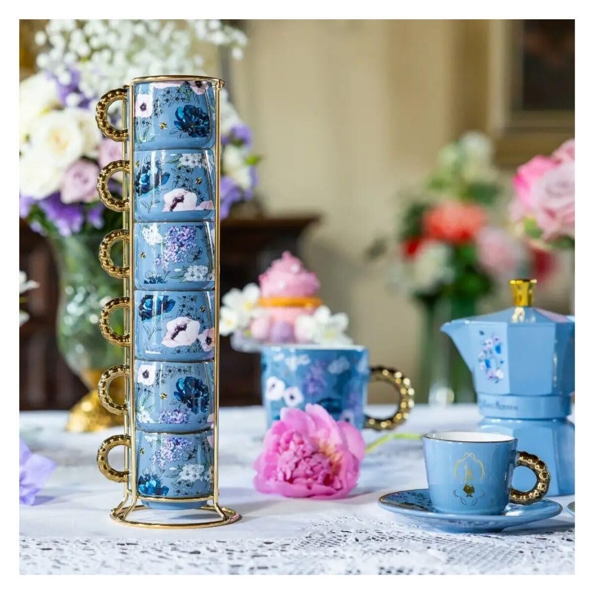 Kahve molanızı daha da romantik ve sofistike hale getirecek bu aksesuar, çiçek motifleri ve altın detaylarıyla benzersiz bir zarafete sahip.
