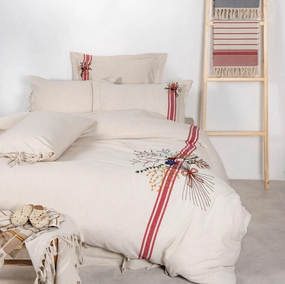 Ecocotton Charla Çift Kişilik Nevresim Takımı %100 Organik Pamuk Kenevir Karışımlı Ekru / Kırmızı CK