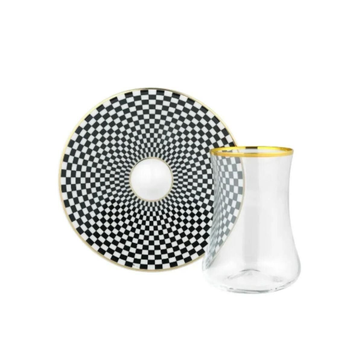 Evaliza Dama Altın 6’lı Çay Seti, altın detaylı dama desenleriyle çay saatlerinizi adeta bir ritüele dönüştürüyor. Modern geometrik desenin klasik altın yaldızla birleştiği bu özel tasarım, sofralarınıza zarafet ve ışıltı katmak için tasarlandı.