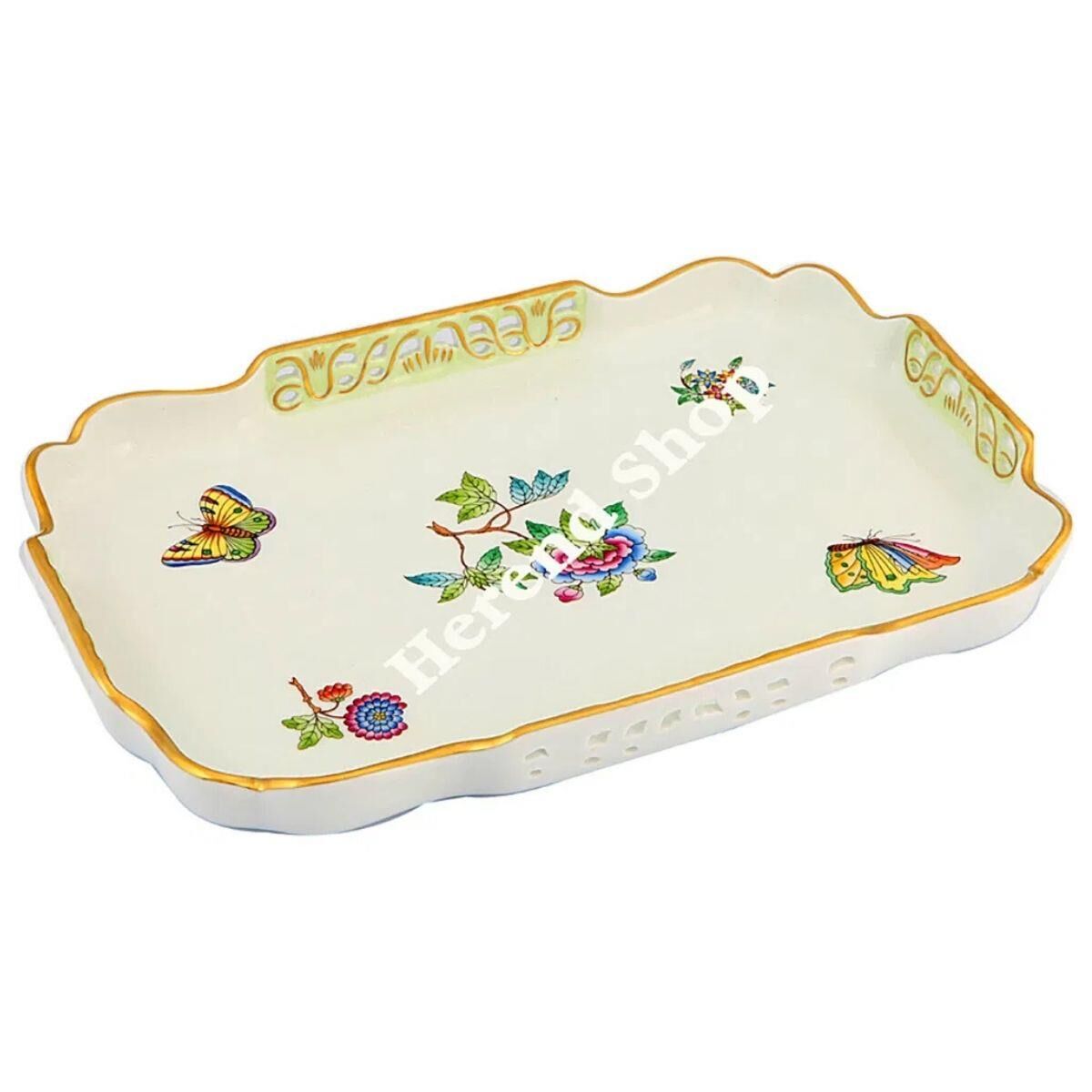 Dikdörtgen servis, VICTORIA desen, birbirinden özel dekor ve desenlere sahip el boyaması Herend Porselen koleksiyonu ile sofralarınızı zenginleştirin. Servis parça ve tabaklarını değişik boylarda yemek tabakları ile tamamlayabilirsiniz. Herend porselen yemek takımınızı oluştururken, takım parçalarınızı tekli olarak seçebilir arzunuza göre set oluşturabilirsiniz. Ayrıca birbirinden farklı desen ve dekorları da karıştırabilirsiniz. Bu dikdörtgen servis tabağının yemek takımı, büyük, küçük, renkli, çeşitli servis tabakları, kulplu servis tabakları, çorbalık, meze tabakları, yuvarlak servisleri, kare servisleri, salata servisleri, pilav servisi, sebze servisi, büyük küçük kaseleri ve kapaklı servis parçaları mevcuttur.