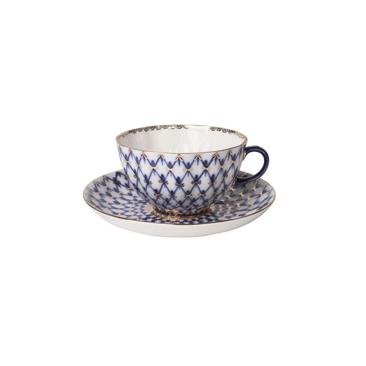 Material Hard porcelain Volume 250 ml Weight 351 g Kobalt örgü desenli çay bardağı ve tabağı, Imperial Porselen Fabrikası'nda sert porselenden sadece el boyaması kullanılarak yapılmıştır. Lale şekli Çizimin yazarı Yatskevich A.A.'dır.
