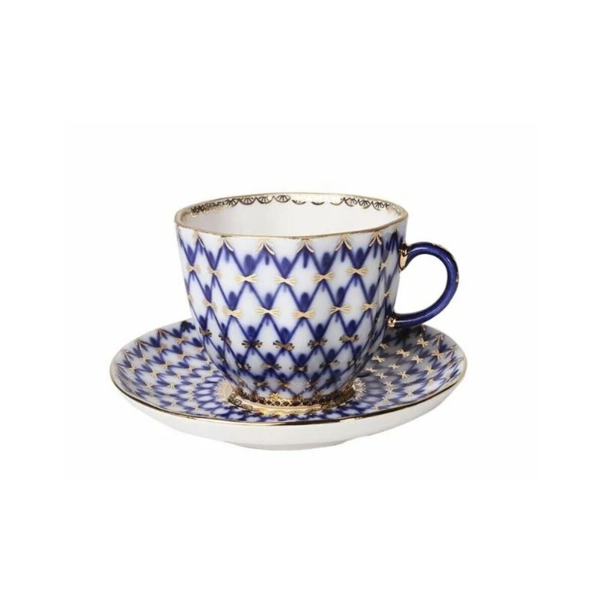 Kahve fincanı ve tabak pilavı. Kobalt ağ, Imperial Porselen Fabrikası'nda sert porselenden yalnızca el boyaması kullanılarak yapılmıştır. Çizimin yazarı Yatskevich A.A.'dır. Ürün hacmi - 140 ml.