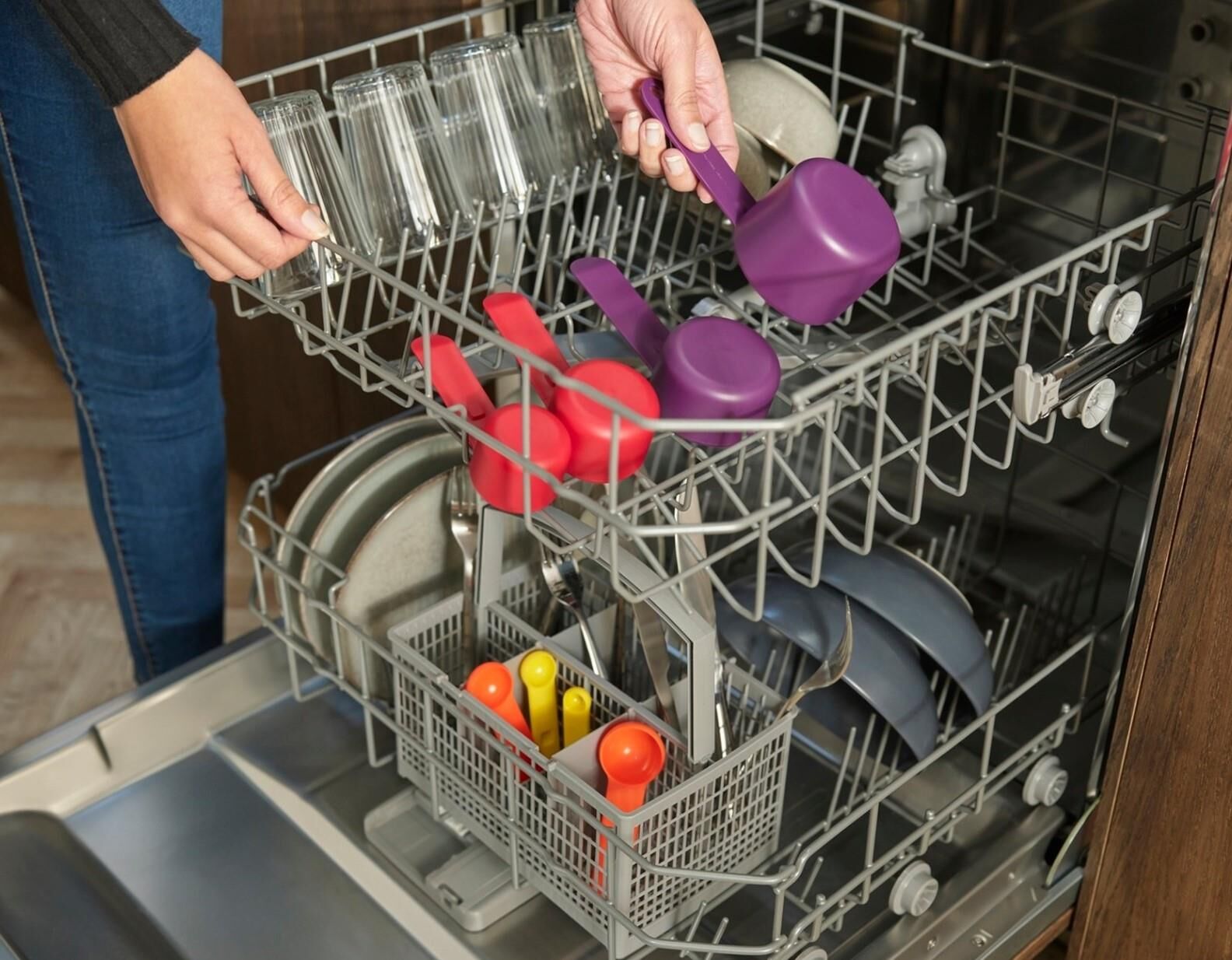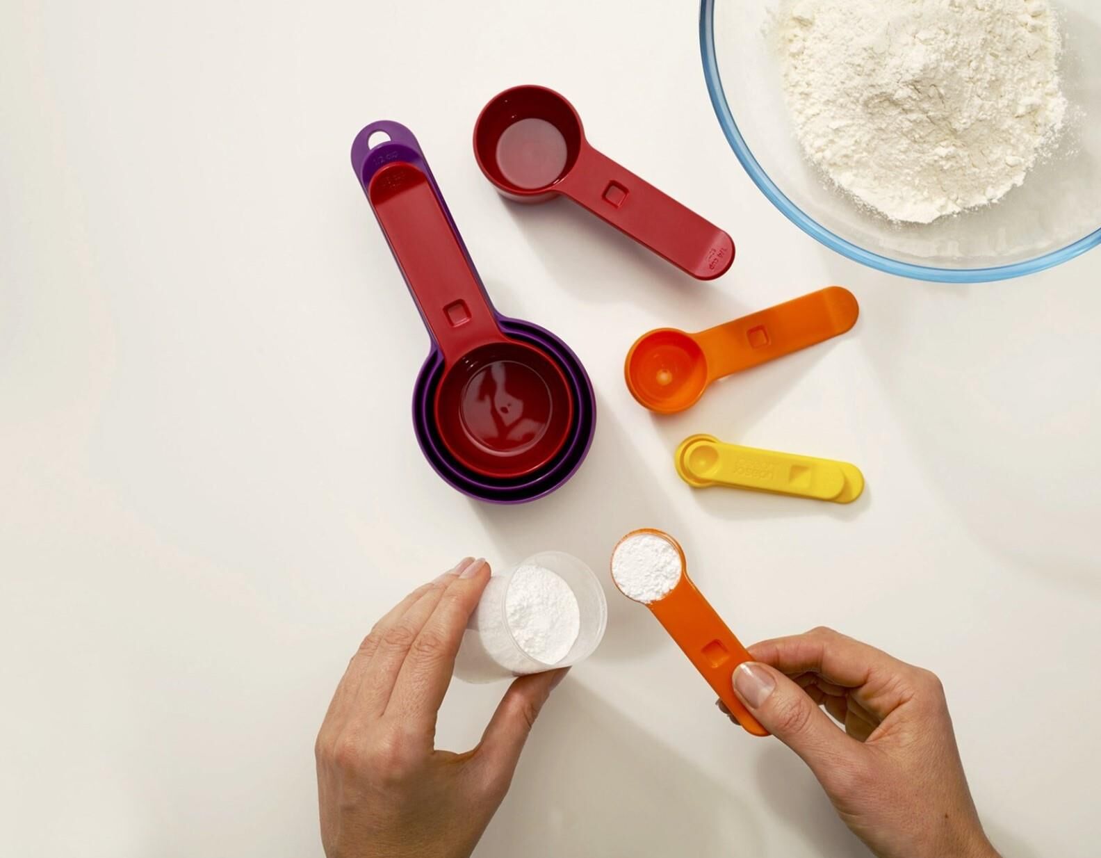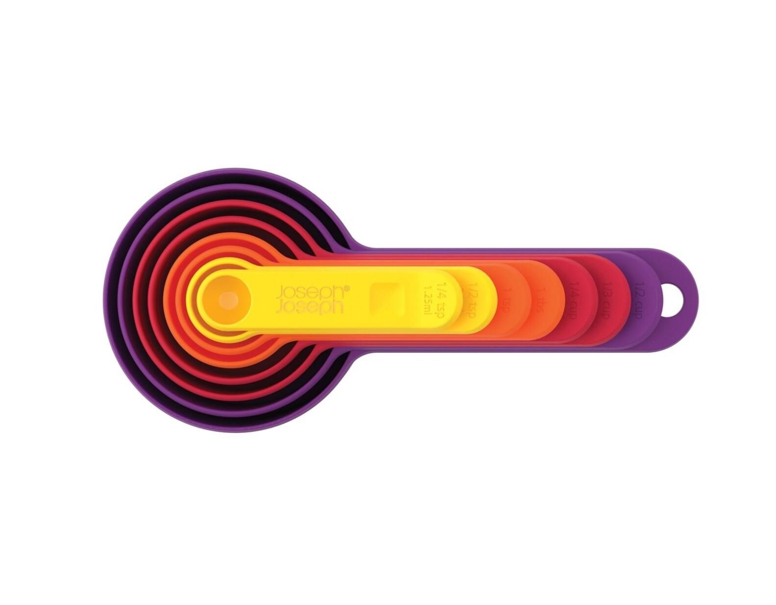 Nest™ Measure, 8 farklı ölçüm kabı içeren kapsamlı bir settir. ¼ çay kaşığı (1,25 ml), ½ çay kaşığı (2,5 ml), 1 çay kaşığı (5 ml), 1 yemek kaşığı (15 ml), ¼ su bardağı (60 ml), ¹⁄³ su bardağı (85 ml), ½ su bardağı (125 ml), 1 su bardağı (250 ml). Rahat ve düzenli depolama için birbirinin içine geçen saplara sahiptir. Tek tek malzemeleri ölçmek için tüm setle uğraşmanıza gerek kalmayacak şekilde kolayca ayrılırlar. Lütfen mikrodalga fırında kullanmayın. 8 parçalı set şunları içerir: 1 çay kaşığından (5 ml) 1 su bardağına (250 ml) kadar ölçü kapları. İçiçe geçen saplar.Yerden tasarruf sağlayan tasarım. Metrik ve emperyal ölçü birimleri.