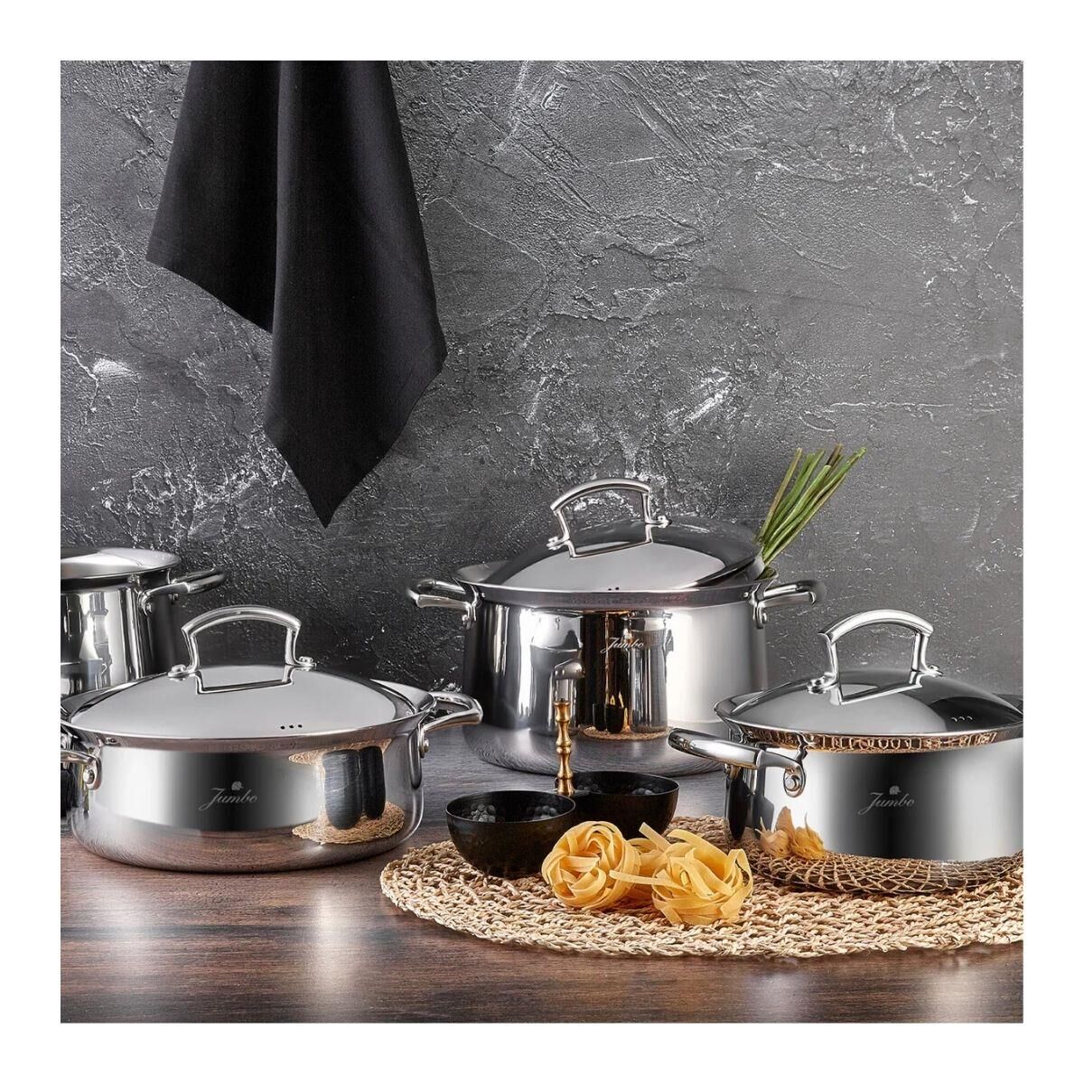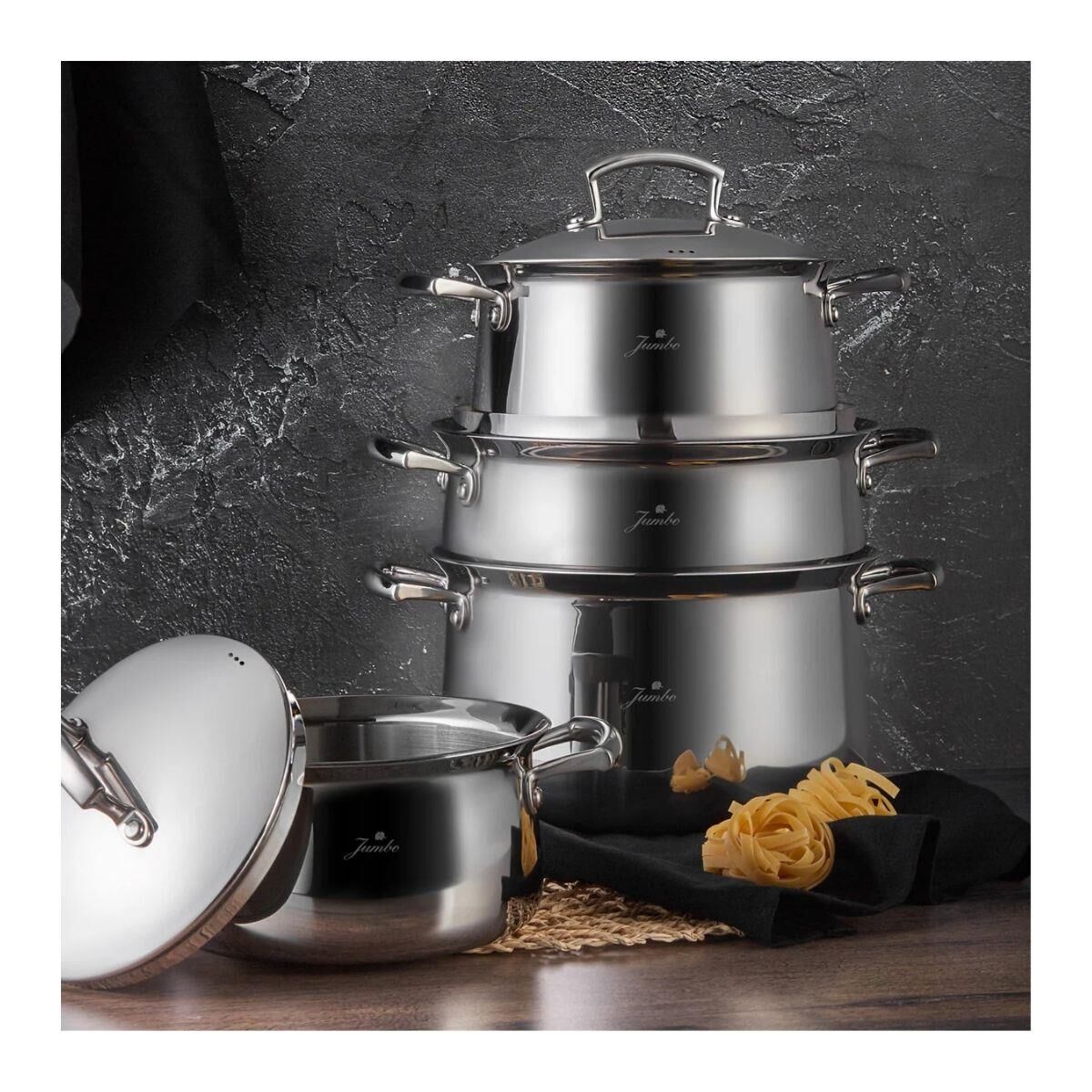 Şık bir tasarıma sahip olan Jumbo 5 ply tencereler, mutfakta estetik bir görünüm sunar.