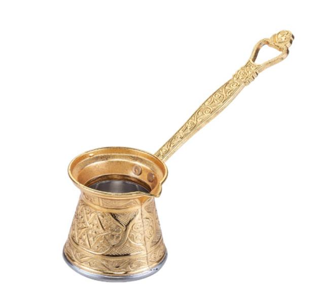 Mükemmel Tasarım: Altın rengi ve zamak döküm yapısıyla bu cezve, mutfağınıza sofistike bir dokunuş ekler.