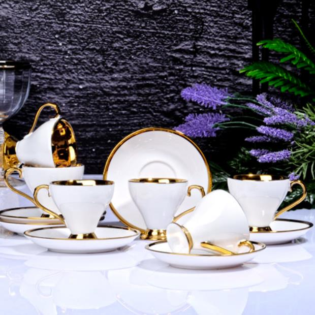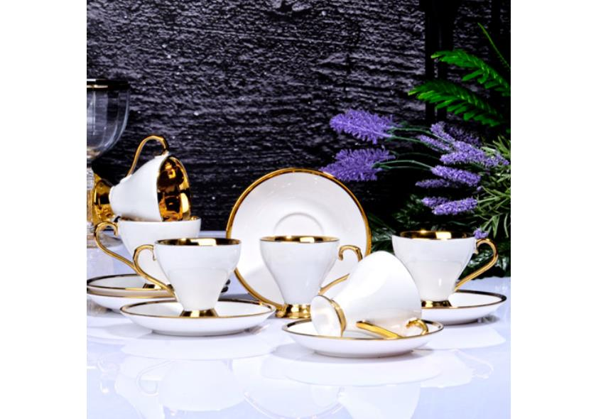 Kosova İst-77 Porselen 90cc 6'lı Yaldız Ayaklı Fincan Takımı Whitw Tabak Gold