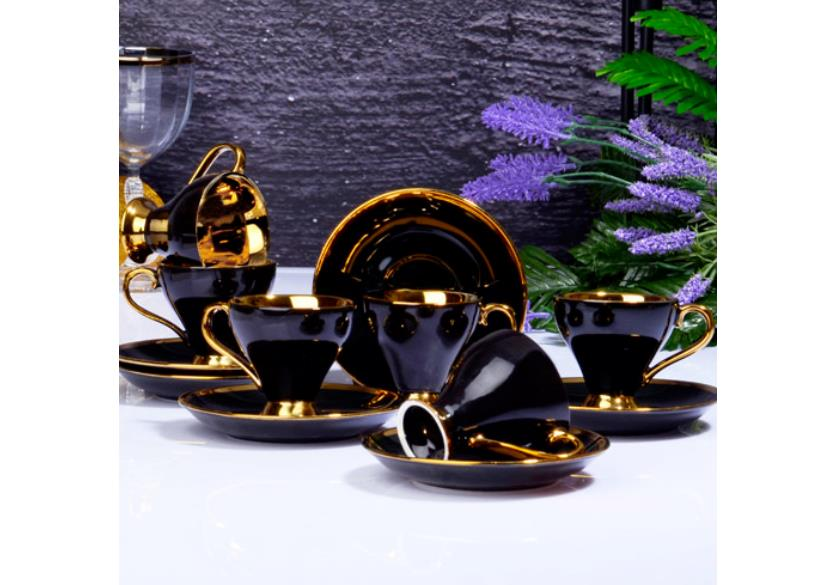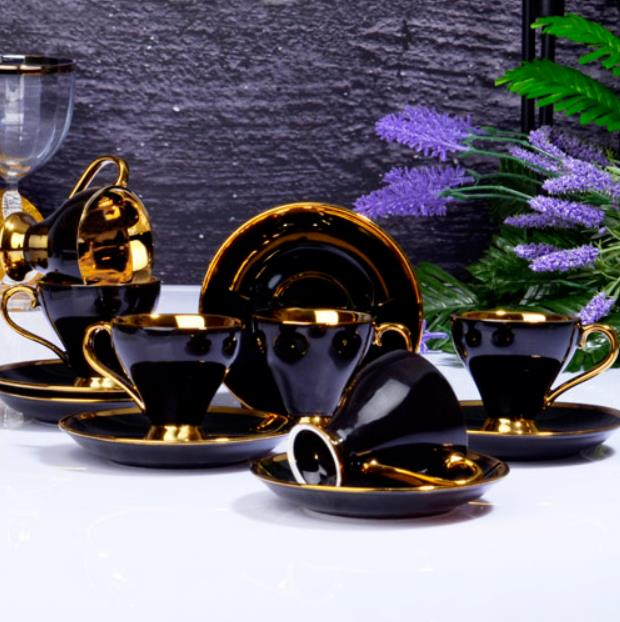 Kosova İst-78 Porselen 90cc 6'lı Yaldız Ayaklı Fincan Takımı Black Tabak Gold