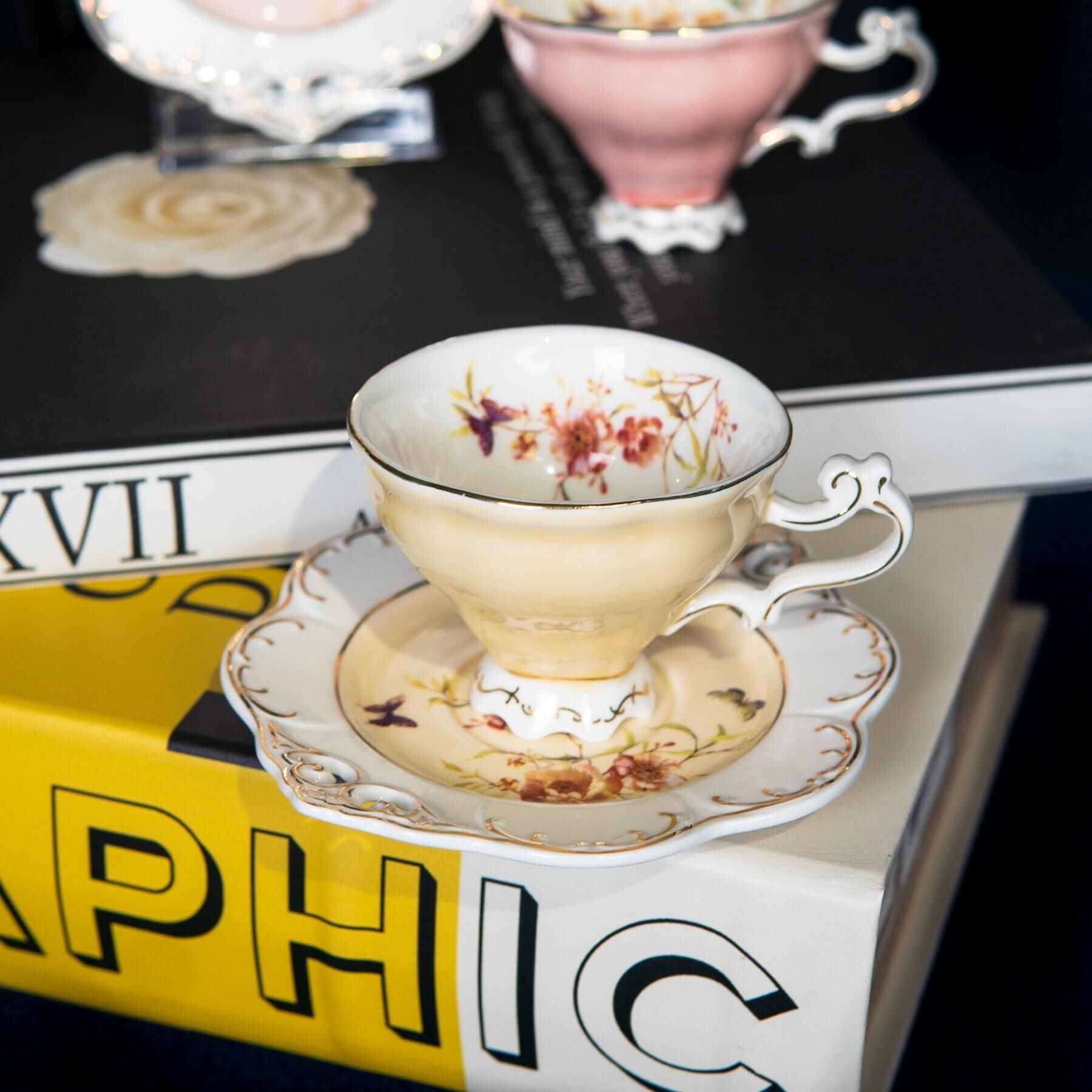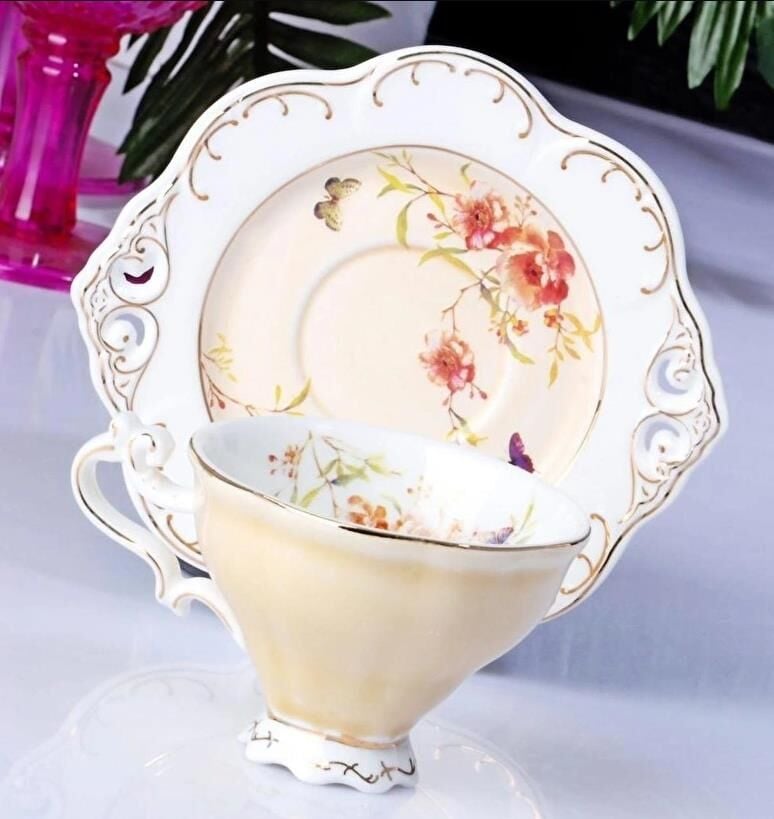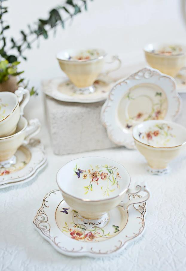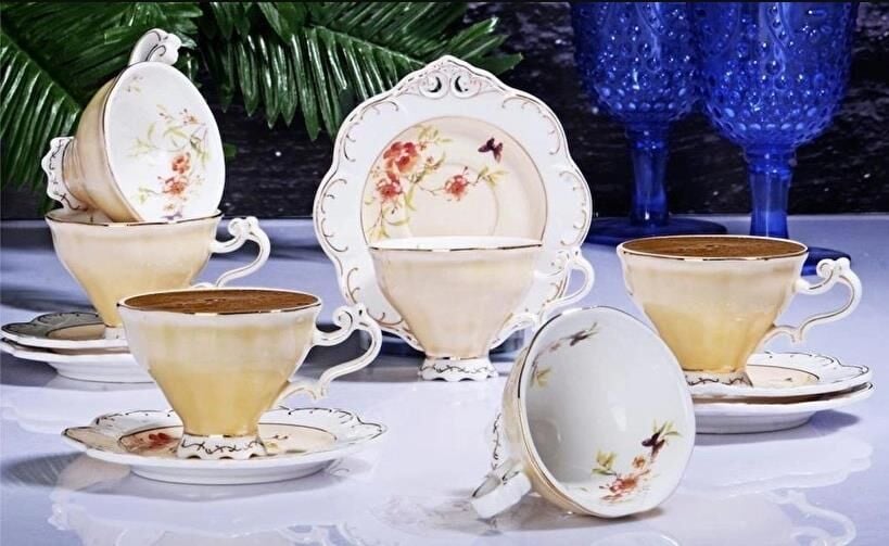 Kosova Zjn-02 Porselen 6'lı Fincan Takımı Ayaklı Flower Krem
