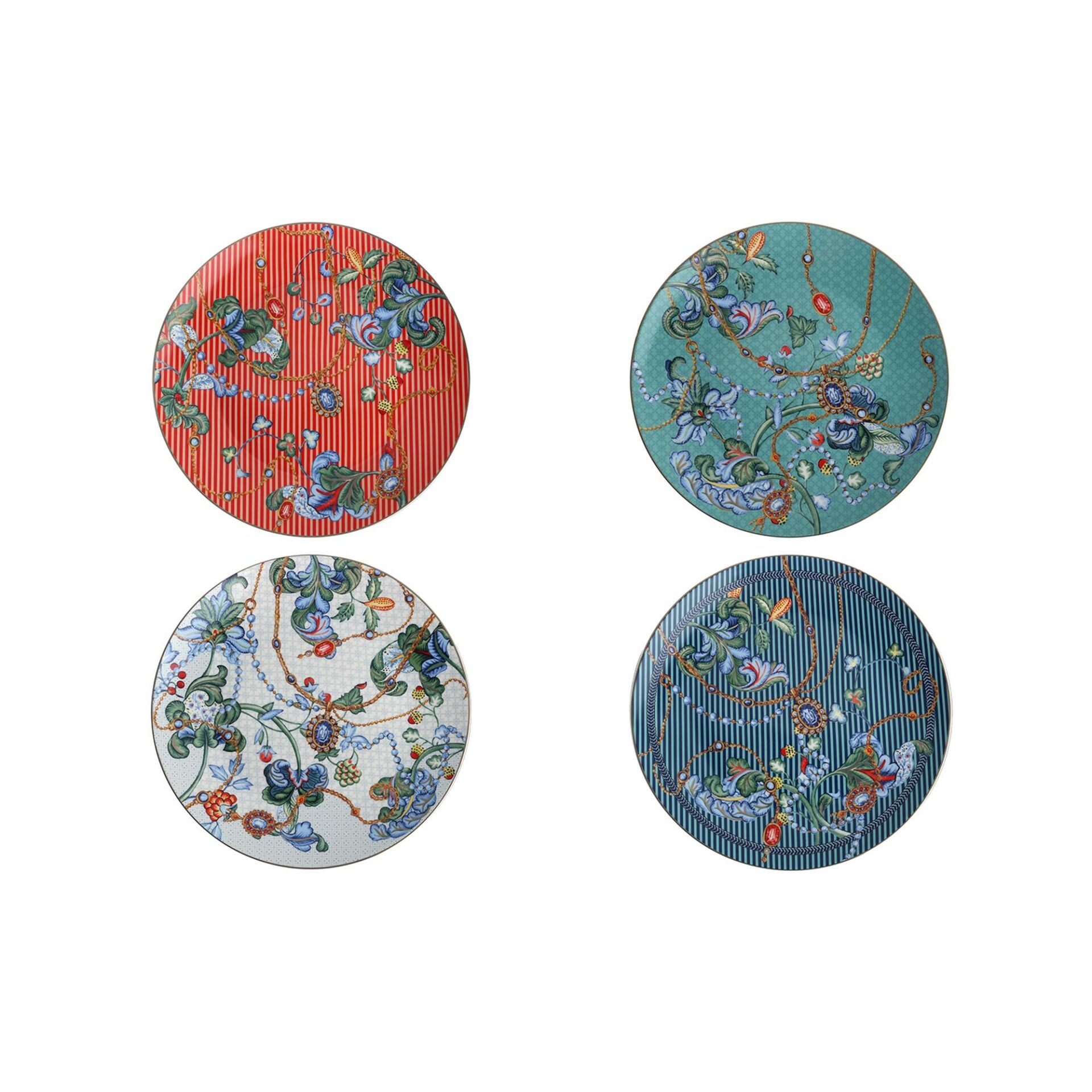 Lucky Art Chantelle New Bone China Porselen 27 cm 4lü Servis Tabağı Seti evlerinize enerjik, hareketli ve göz alıcı tasarımların buluştuğu, renklerin dans ettiği özgün bir koleksiyon sunuyor. Zincir ve çiçek desenlerinin iç içe geçtiği bu özel seri, modern ve klasik detayları bir araya getirerek benzersiz bir görünüm sağlıyor.