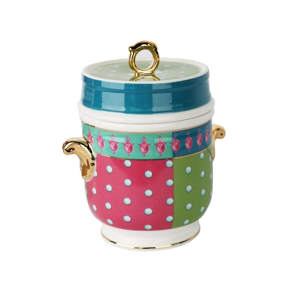 Estelle Bone China Porselen Karışık Desenli Kulplu Kavanoz, 16 cm yüksekliğiyle hem şık hem de pratik bir depolama çözümüdür. Yüksek kaliteli bone china porselenden üretilmiş bu zarif kavanoz, canlı ve çeşitli karışık desenlerle bezenmiştir; mavi, yeşil, altın ve pastel tonlarıyla estetik bir görünüm sunar. Kulplu tasarımı, kavanozun kullanımını kolaylaştırırken, içeriğinizi güvenli ve düzenli bir şekilde saklamanıza olanak tanır. Çay, kahve, şeker veya kuruyemiş gibi mutfak gereçlerini şık bir şekilde depolamak için ideal bir seçenektir. Elde yıkanması tavsiye edilen bu kavanoz, uzun ömürlü kullanım ve zarif bir dokunuş sağlar, mutfaklarınıza zarif bir hava katar.