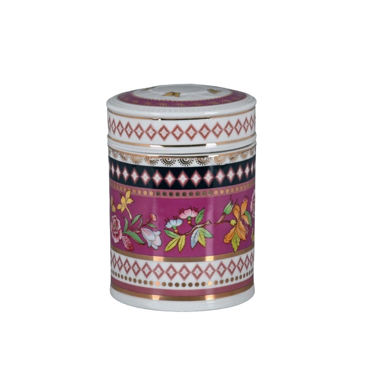Evelyn Kavanoz, canlı fuşya rengi ve katmanlı, zengin desenleriyle evinize lüks ve egzotik bir hava katıyor. 17 cm boyundaki bu iddialı kavanoz, hem gıdalarınızın tazeliğini korur hem de göz alıcı tasarımıyla dekoratif bir odak noktası oluşturur. En kaliteli Bone porselen malzemesiyle üretilmiştir.Ürün ÖzellikleriSet İçeriği: 1 adet kavanoz (kapaklı)Boyut: 17 cm yükseklikMalzeme: Bone porselenKapak: Hava geçirmeyen kapak ile uzun süre tazelik korumasıKullanım: Mutfakta gıda saklama (çay, şeker, baharat vb.), dekorasyon veya küçük eşyaların düzenlenmesi.Bakım: Elde yıkama önerilir.DesenlerKavanozun alt kısmı, canlı fuşya/magenta zemin üzerinde narin çiçek ve kelebek motifleriyle bezenmiştir. Orta kısım, siyah, beyaz ve altın detaylı geometrik ve damalı bantlardan oluşan katmanlı bir tasarıma sahiptir. Kapak üzerinde de aynı desenler devam eder.Teknik Bilgiler ve DayanıklılıkBone porselenin dayanıklı yapısı sayesinde kavanoz, günlük kullanıma karşı dirençlidir. Hava geçirmeyen kapak sistemi, içerisine koyacağınız gıdaların tazeliğini korur. Çatlamaya ve renk solmasına karşı dayanıklıdır.Detaylar ve Kullanım AlanlarıBu kavanoz, çarpıcı rengi ve detaylı tasarımı sayesinde mutfak tezgahınızda veya vitrininizde güçlü bir odak noktası oluşturur. Evelyn koleksiyonunun zenginliğini ve cesur renklerini sevenler için prestijli bir hediye seçeneğidir.Evelyn kavanoz ile saklama alanlarınıza sanatsal bir ihtişam katın.