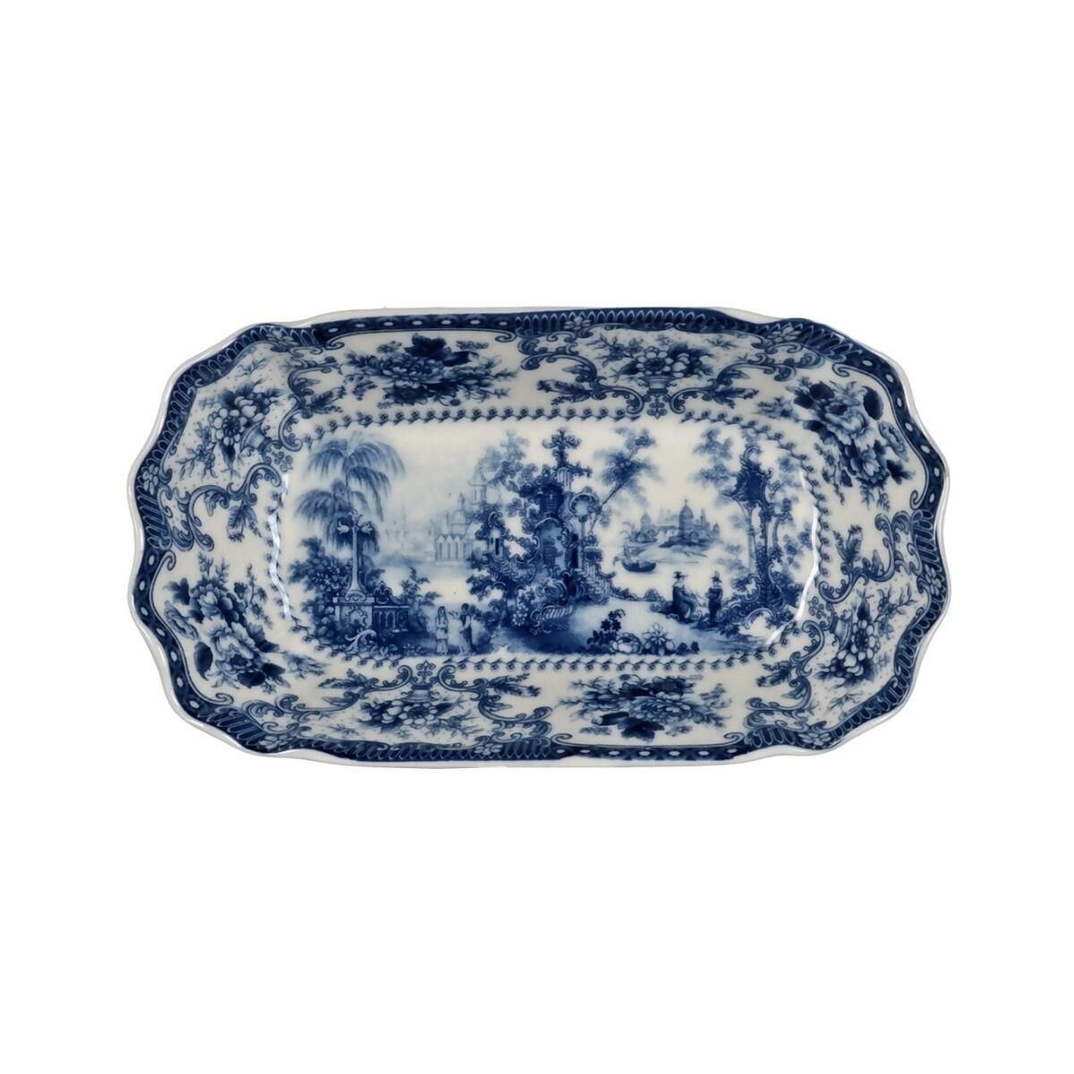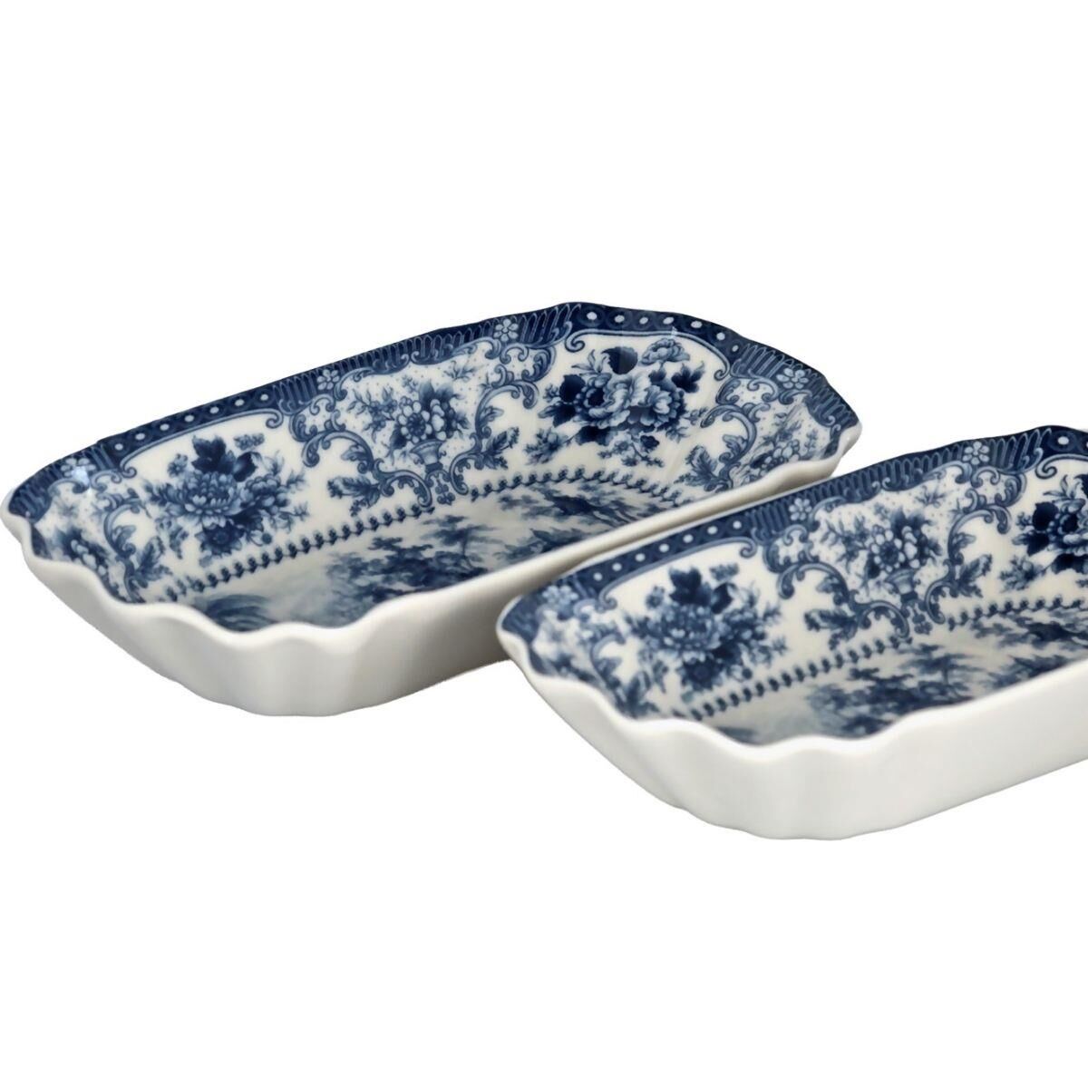 Tabaklar, geleneksel porselen sanatını yansıtan, yoğun mavi renkte manzara veya pastoral motiflerle süslenmiştir. Tabakların köşeli ve dalgalı kenarları, deseni zarifçe çevreler ve klasik görünümü tamamlar.