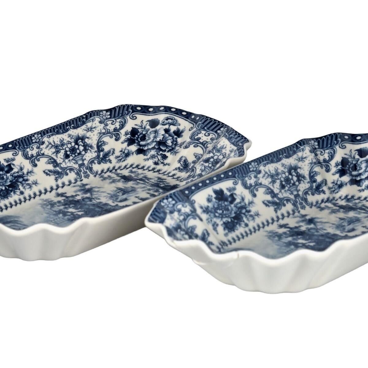 Tabaklar, geleneksel porselen sanatını yansıtan, yoğun mavi renkte manzara veya pastoral motiflerle süslenmiştir. Tabakların köşeli ve dalgalı kenarları, deseni zarifçe çevreler ve klasik görünümü tamamlar.