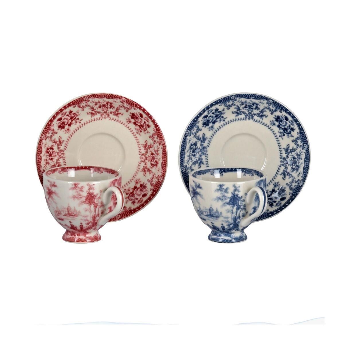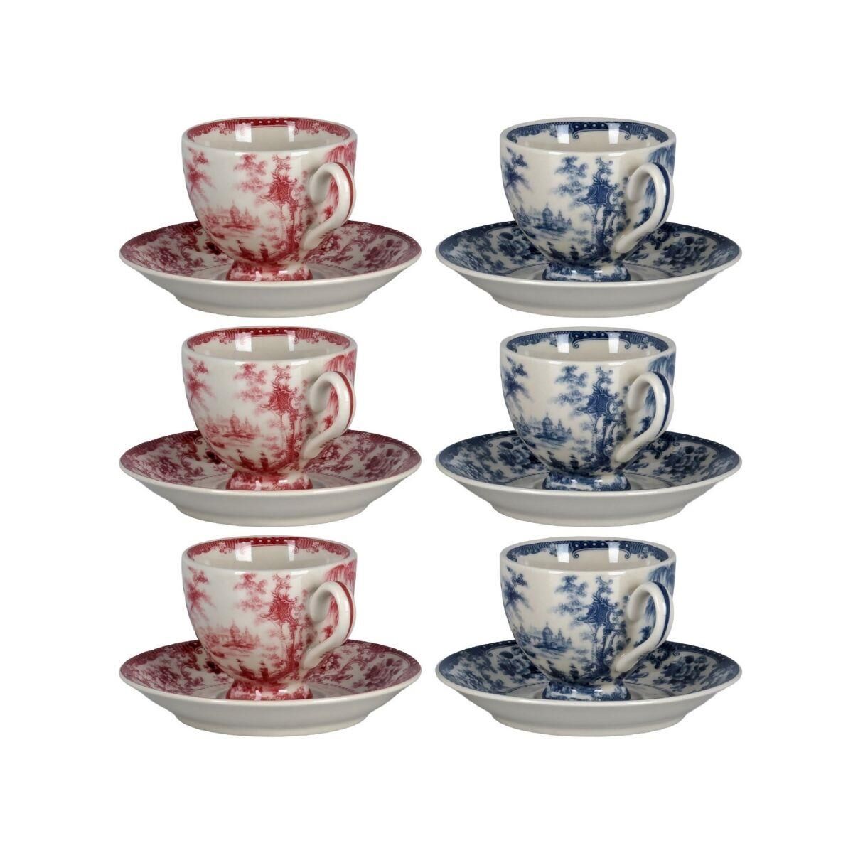 Set İçeriği: 6 adet ayaklı kahve fincanı, 6 adet fincan tabağı (3 Kırmızı, 3 Mavi desenli)