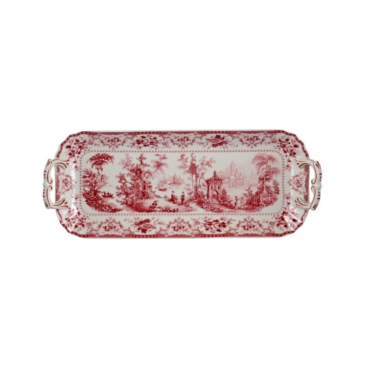 Tepsinin tüm yüzeyi, Florantine koleksiyonuna özgü, yoğun kırmızı renkte manzara veya pastoral sahne motifleriyle süslenmiştir. Beyaz zemin üzerindeki bu monokrom desen, tepsinin merkezi ve kenarlarındaki dalgalı bordürlerle bütünleşerek sıcak ve klasik bir görünüm yaratır.