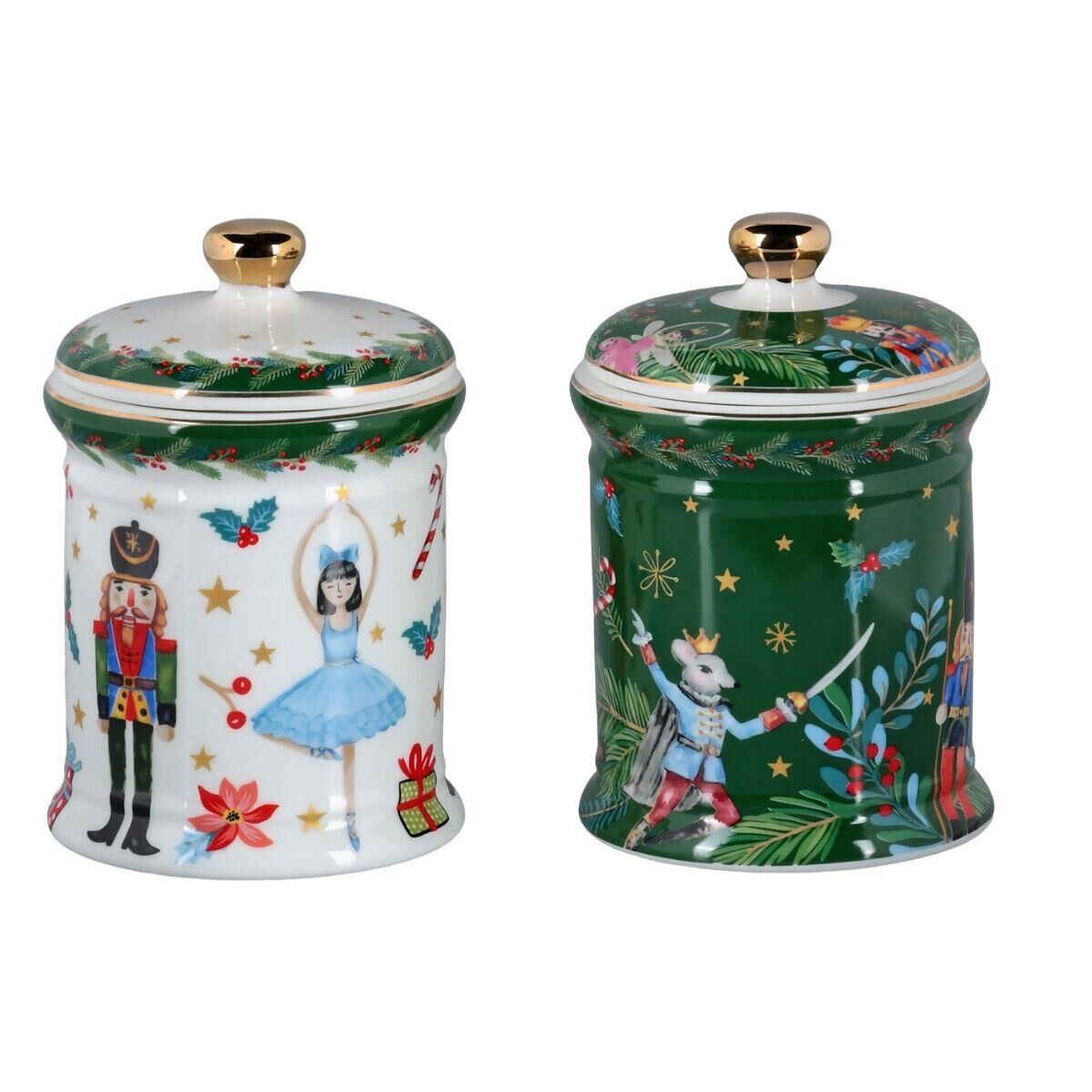 Setin kavanozlarından biri, canlı yeşil rengi ve neşeli yılbaşı figürleriyle dikkat çekerken, diğeri beyaz zemin üzerine işlenmiş masalsı figürleriyle sade bir şıklık sunar. Bu kavanozlar; kurabiye, şekerleme, kahve veya baharat gibi mutfak malzemelerini saklamak için idealdir. Yılbaşı temalı tasarımı sayesinde, sevdiklerinize anlamlı ve kullanışlı bir hediye alternatifi de sunar.