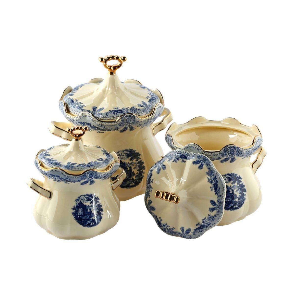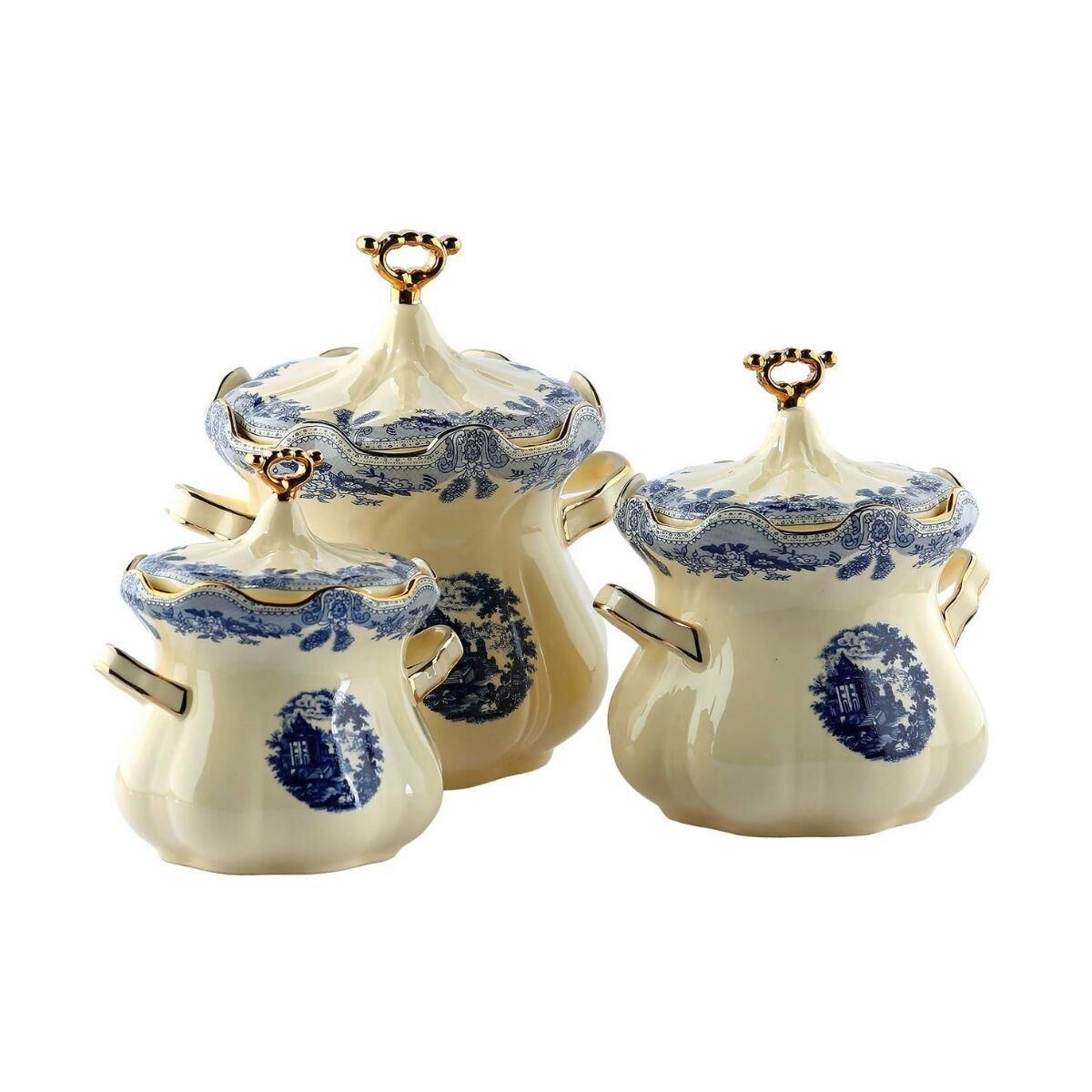 Margaret New Bone 3’lü Kavanoz Seti, farklı boylardaki kavanozlarıyla kahve, şeker, un gibi temel malzemelerinizi taze ve düzenli bir şekilde saklamanızı sağlar. Klasik mavi-beyaz desenleri ve altın detaylı zarif kapak tasarımıyla mutfağınıza nostaljik bir şıklık katar.