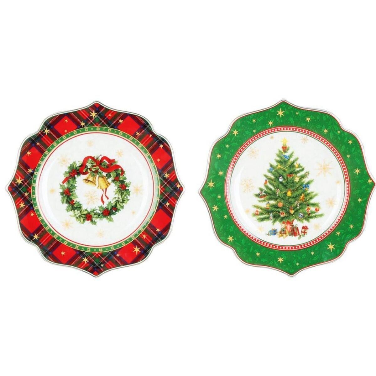 Tasarım: Tabaklar, yeşil ve kırmızı tartan desenli kenar süslemeleri, Noel ağacı ve çelenk motifleriyle çevrilidir.