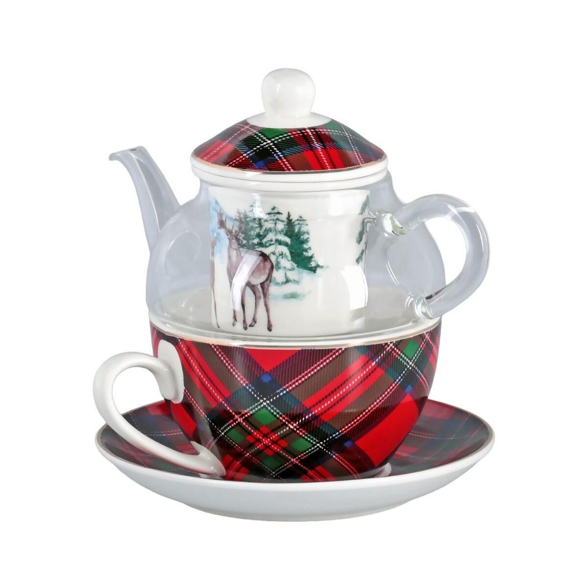 Fincan ve tabağı klasik kırmızı ve yeşil ekose deseniyle bezenmiştir. Demliği ise, beyaz zemin üzerinde yer alan sevimli bir geyik ve orman temalı figürlerle süslenmiştir.