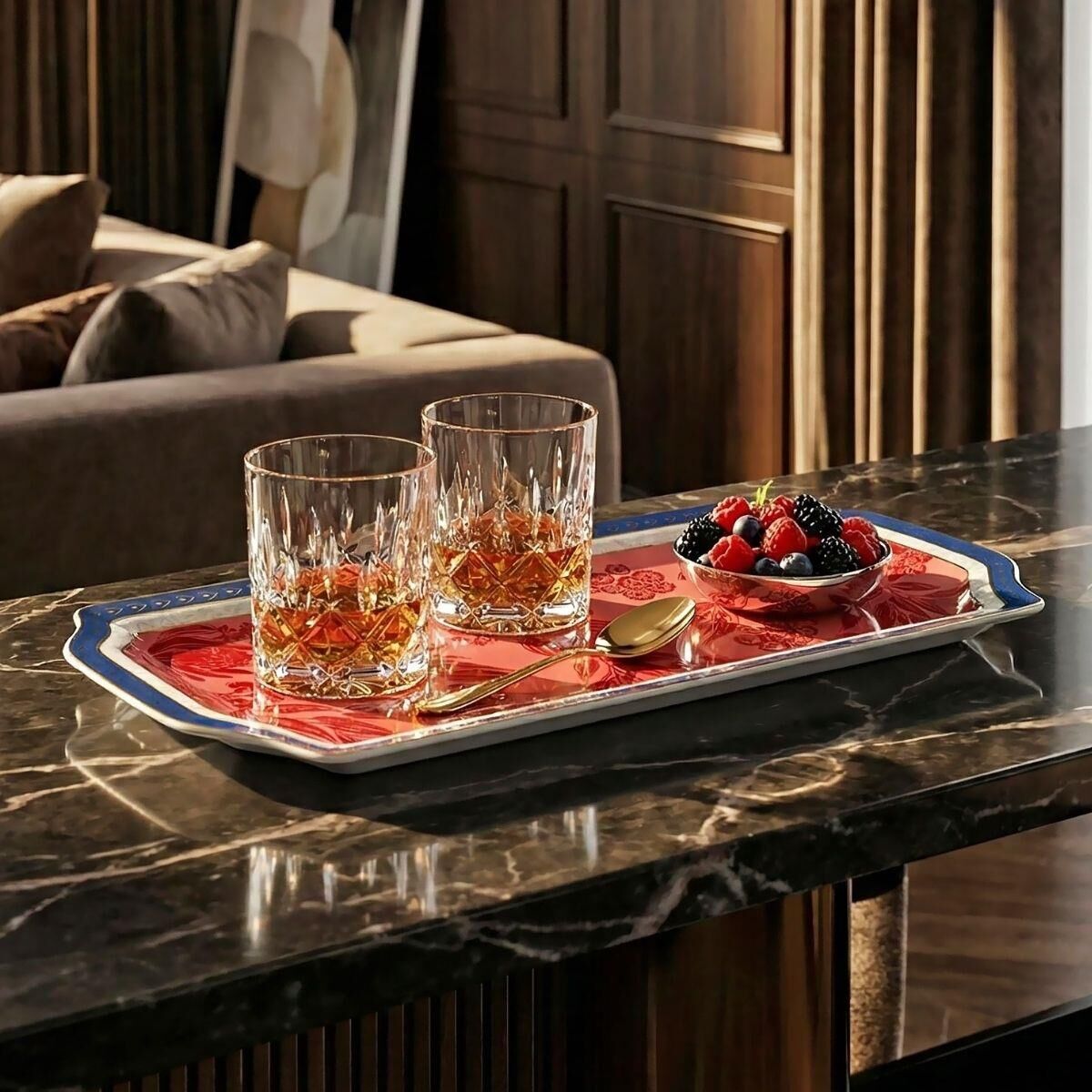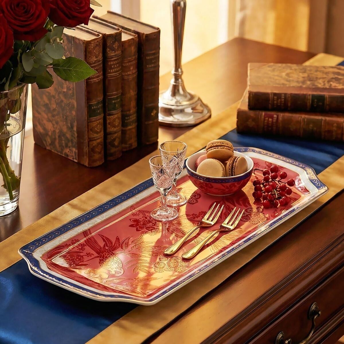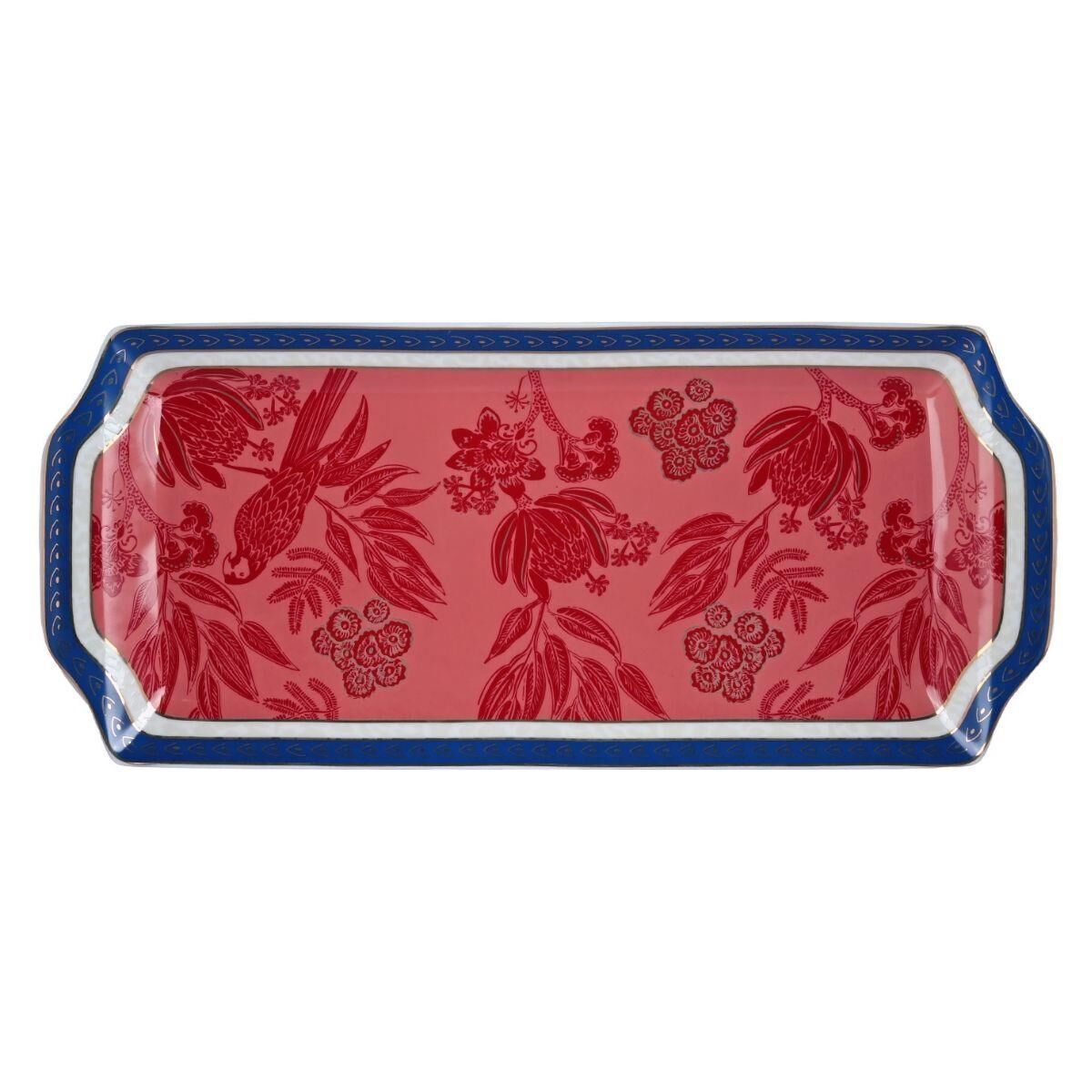 Estetik Tasarım: Canlı kırmızı zemin üzerine işlenmiş egzotik desenler, lacivert ve beyaz çerçeve detaylarıyla çevrelenerek sunumlarınıza sofistike bir hava katar.