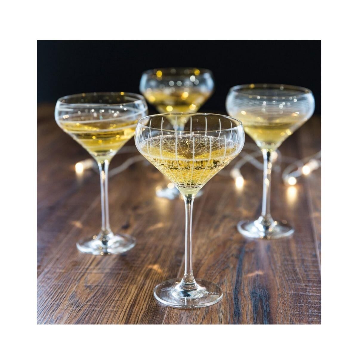 Şık bir hediye kutusunda paketlenmiş dört şampanya tabağı içerir.