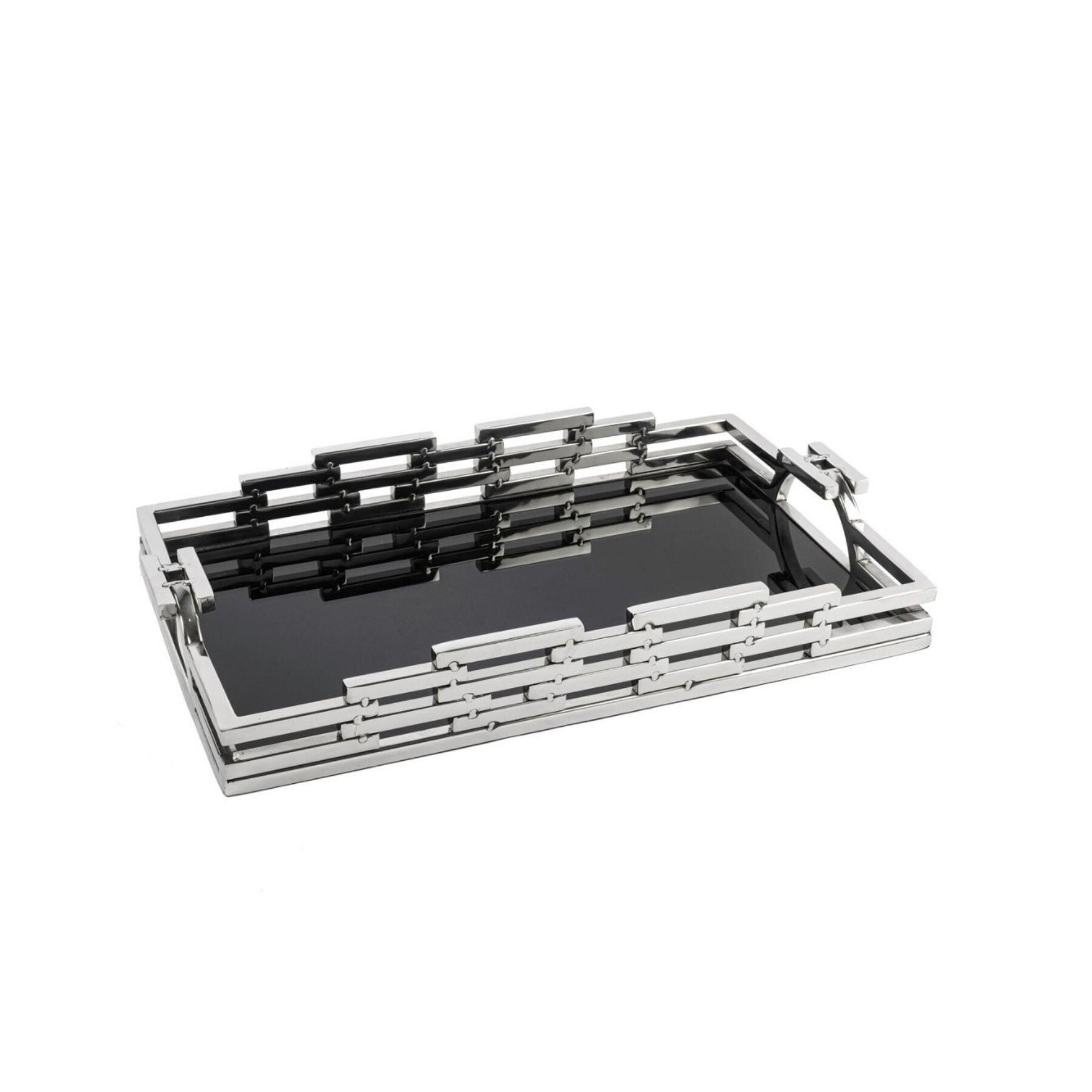 Gümüş Metal Siyah Camlı Tepsi 43x26x6cm – Modern ve Şık Sunumlar İçin