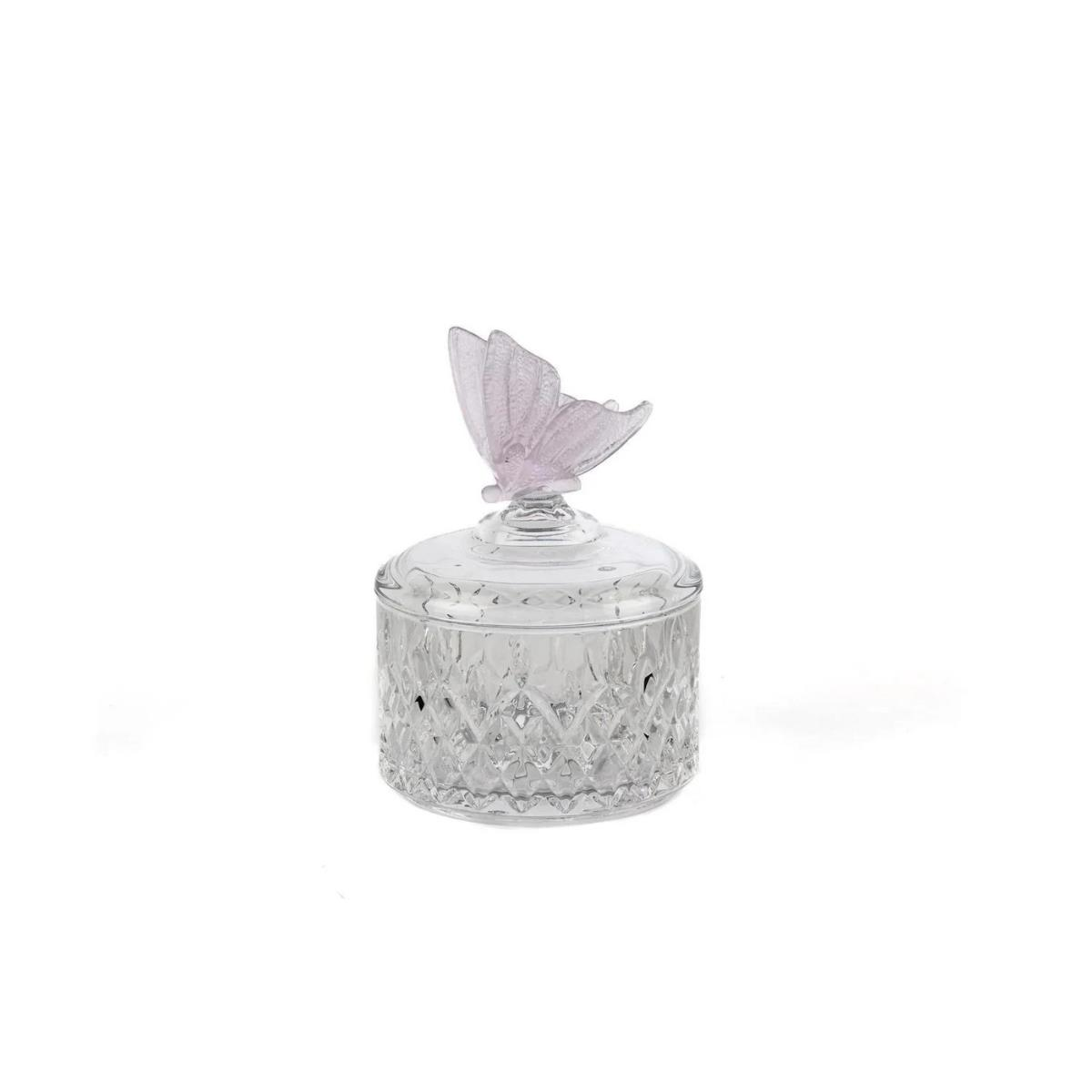 Şık ve Zarif Tasarım: Lila kelebek detaylı kapağı ve camın kristal parlaklığı, bulunduğu her ortamda dikkat çeker.