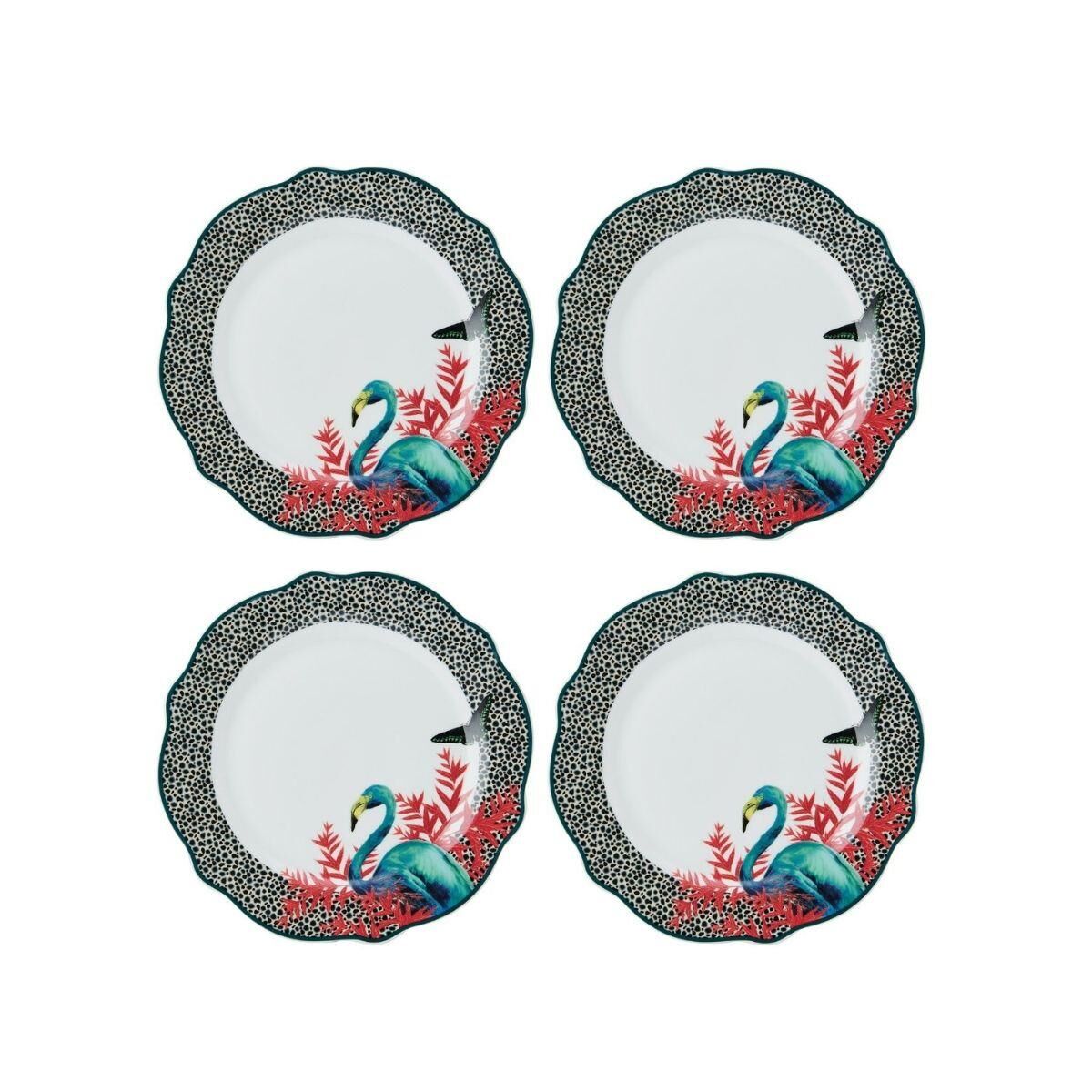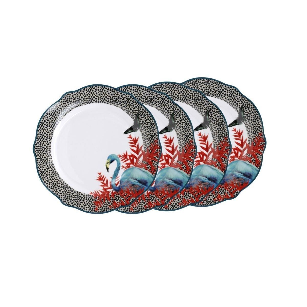 Mikasa x Sarah Arnett koleksiyonunun bir parçası olan bu dört porselen yemek tabağı seti, rengarenk flora ve fauna fonunda renkli bir baskıyla dekore edilmiştir.