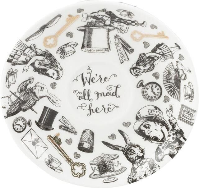 Cep saatleri, pasta standları ve silindir şapkalardan oluşan bir koleksiyonun ortasında Şapkacı Alice ve Beyaz Tavşan'ı tasvir eden kahve fincan seti, siyah beyaz çizimlerle basılmıştır.