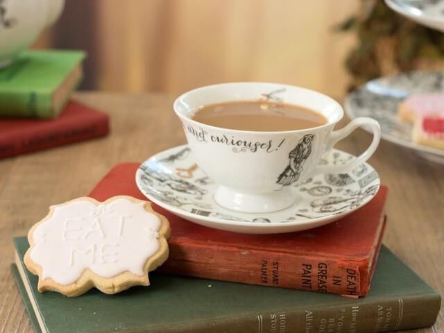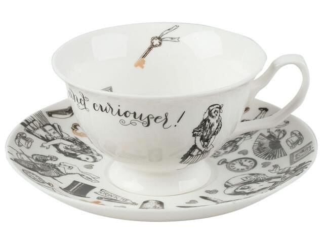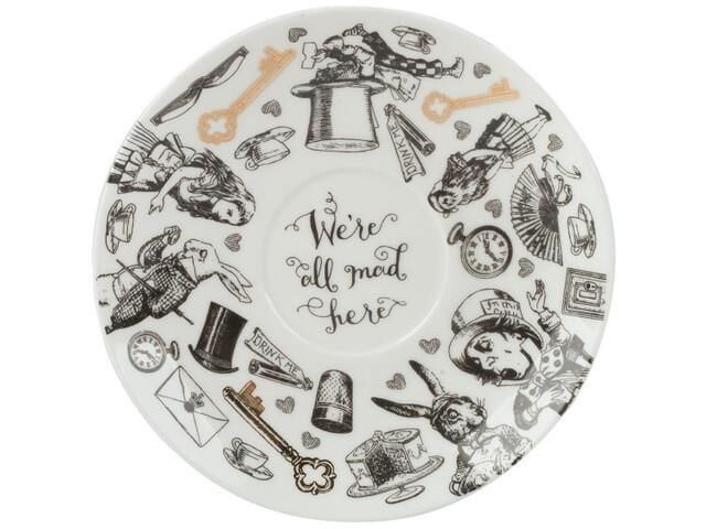Şapkacı'nın çay partisindeki Alice'in bir sahnesini tasvir eden fincan ve tabak, siyah beyaz çizimlerle basılmıştır.