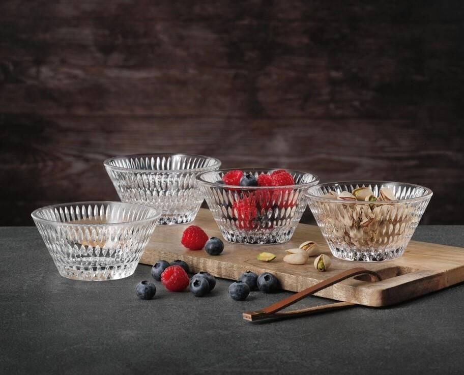 Nachtmann Ethno serisinden 11 cm çapında olan 4’lü kase seti, zarif ve sade cam tasarımıyla meze, tatlı veya sos sunumlarınızı özel hâle getirir. Şeffaf cam yüzeyi sayesinde içeriği net gösterir, sofralarınıza ferah bir görünüm kazandırır. Kristal‑benzeri parlaklığıyla hem günlük kullanım için hem de özel davetlerde estetik bir dokunuş sağlar. 4 parçadan oluşmasıyla eksiksiz bir sunum takımı sunar; kaliteli cam malzemesi sayesinde uzun süre kullanılabilir ve doğru bakım ile ilk günkü hâlini korur.