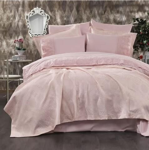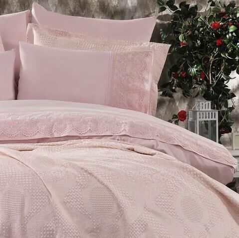 Nazik Home Estina Dantelli Nevresim, Jakar Desenli Yatak Örtüsü 9 Parça Çeyiz Seti Pudra Çift Kişilik