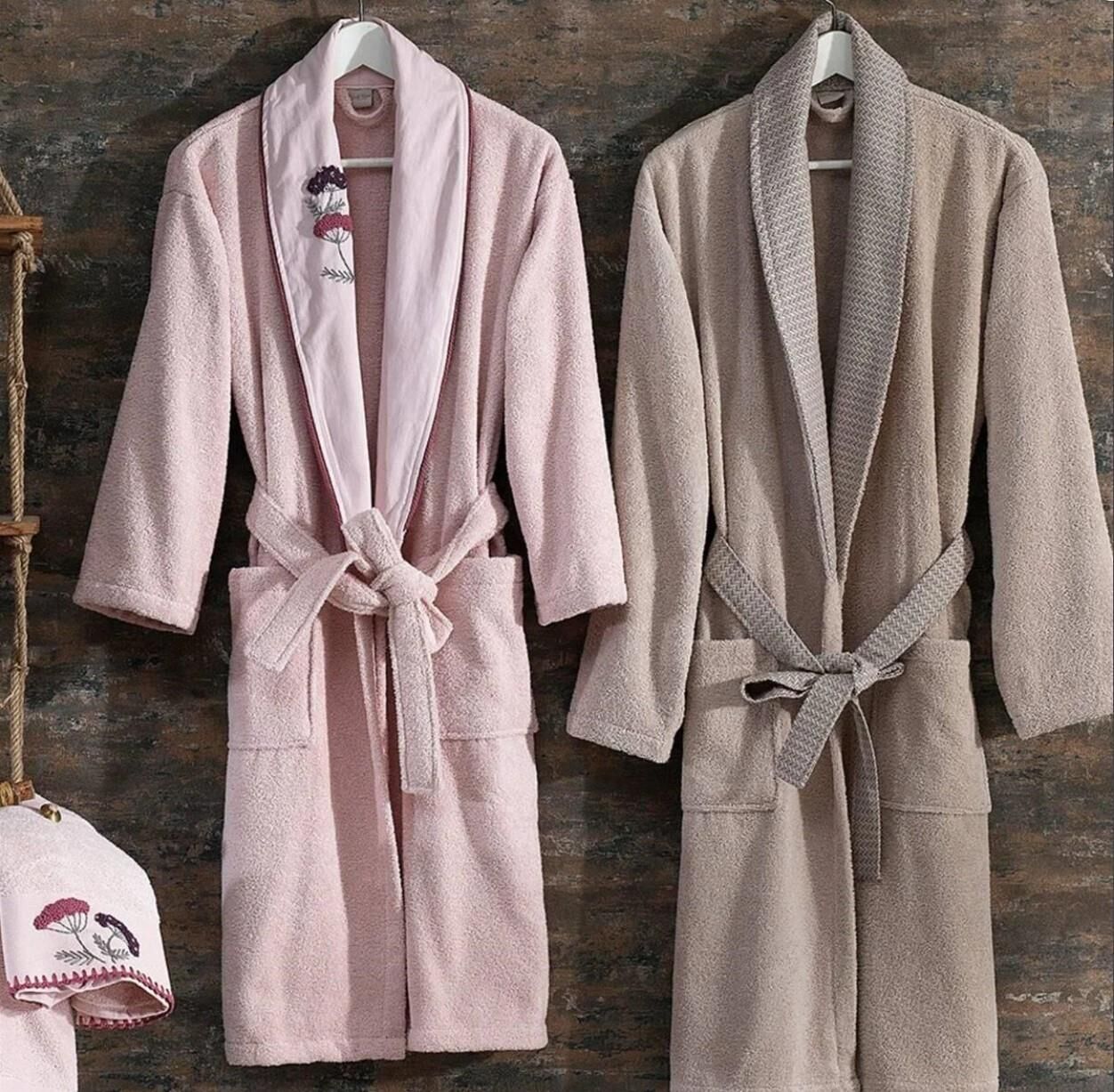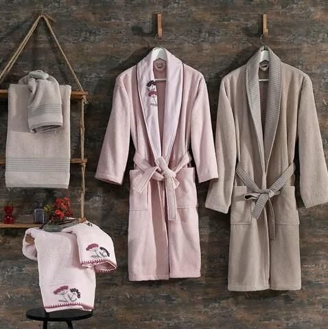 vNazik Home Galia Kadın & Erkek 6 Parça Aile Bornoz Seti Pudra / Bej STD