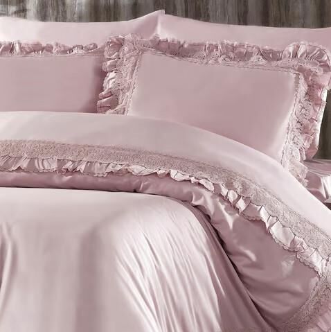 Nazik Home Helen Organik Dantelli Pamuk Saten 6 Parça Çift Kişilik Nevresim Takımı Bej Pudra Çift Kişilik
