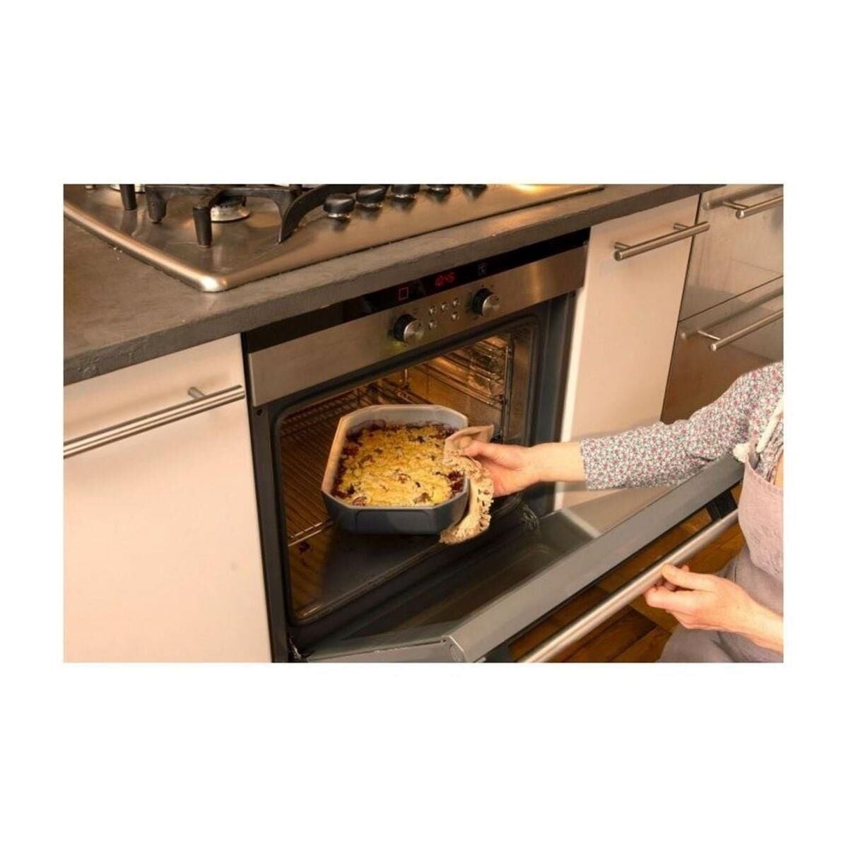 Modern zarafeti Art deco stili ve rahatlığıyla birleştiren benzersiz ve temiz tasarım , pişirme sırasında yiyeceklerin fırında dökülmesini önlemek için derin kenarlar ve optimum saklama için entegre tutamaklar.