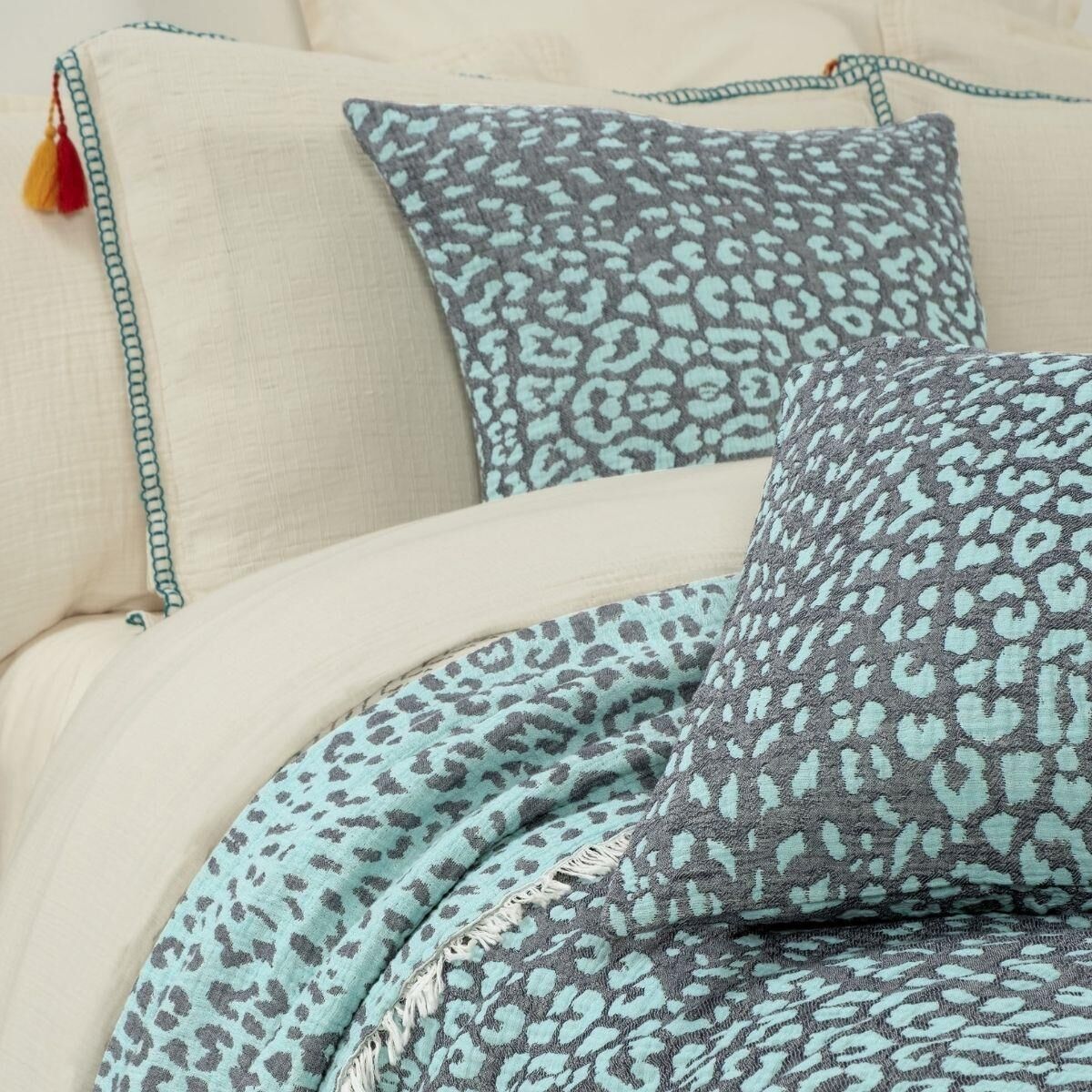 %100 Pamuk, Jakarlı, yıkamalı, iplik boyalı yatak örtüsü.