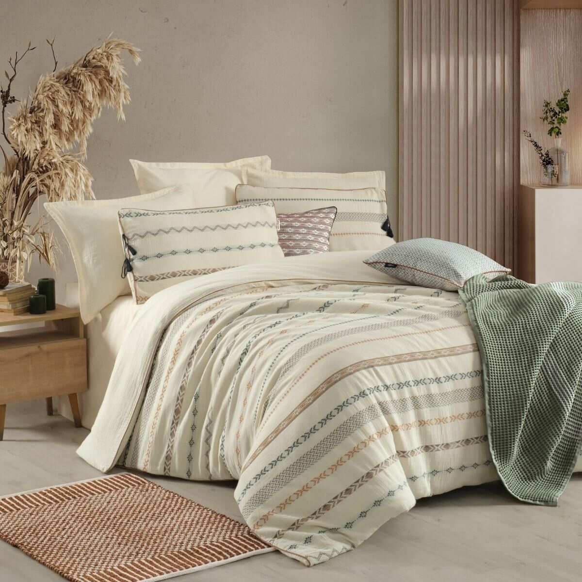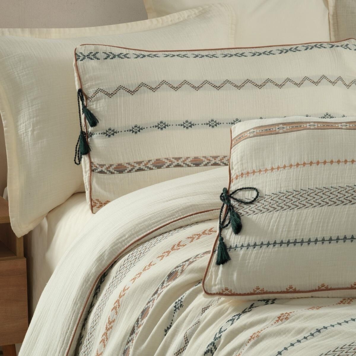 Kumaş Kalitesi;%100 Pamuk, jakarlı, müslin, yıkamalı, iplik boyalı nevresim takımı.Yastık ve nevresim kenarlarında biye detayı. Yastık kenarında püskül bağcık detayı.