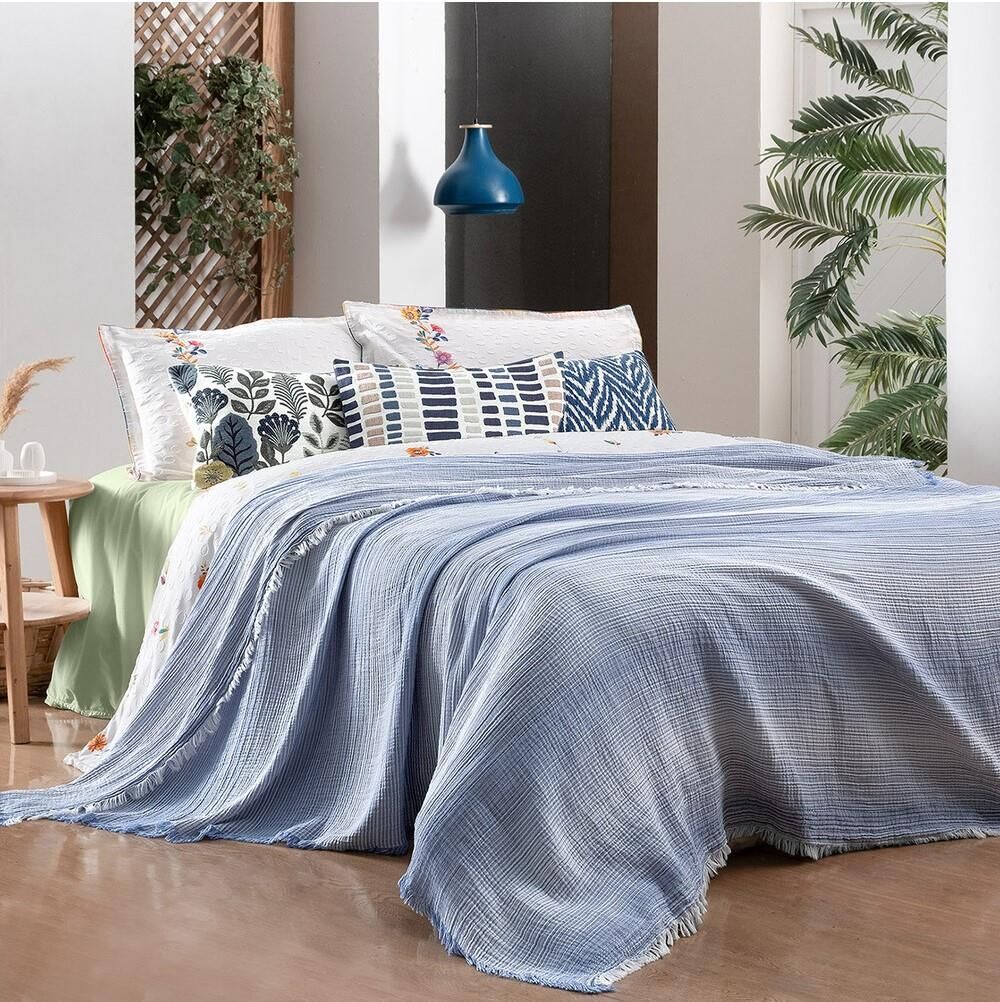 %100 Pamuk , jakarlı, ipliği boyalı, müslin yıkamalı yatak örtüsü.