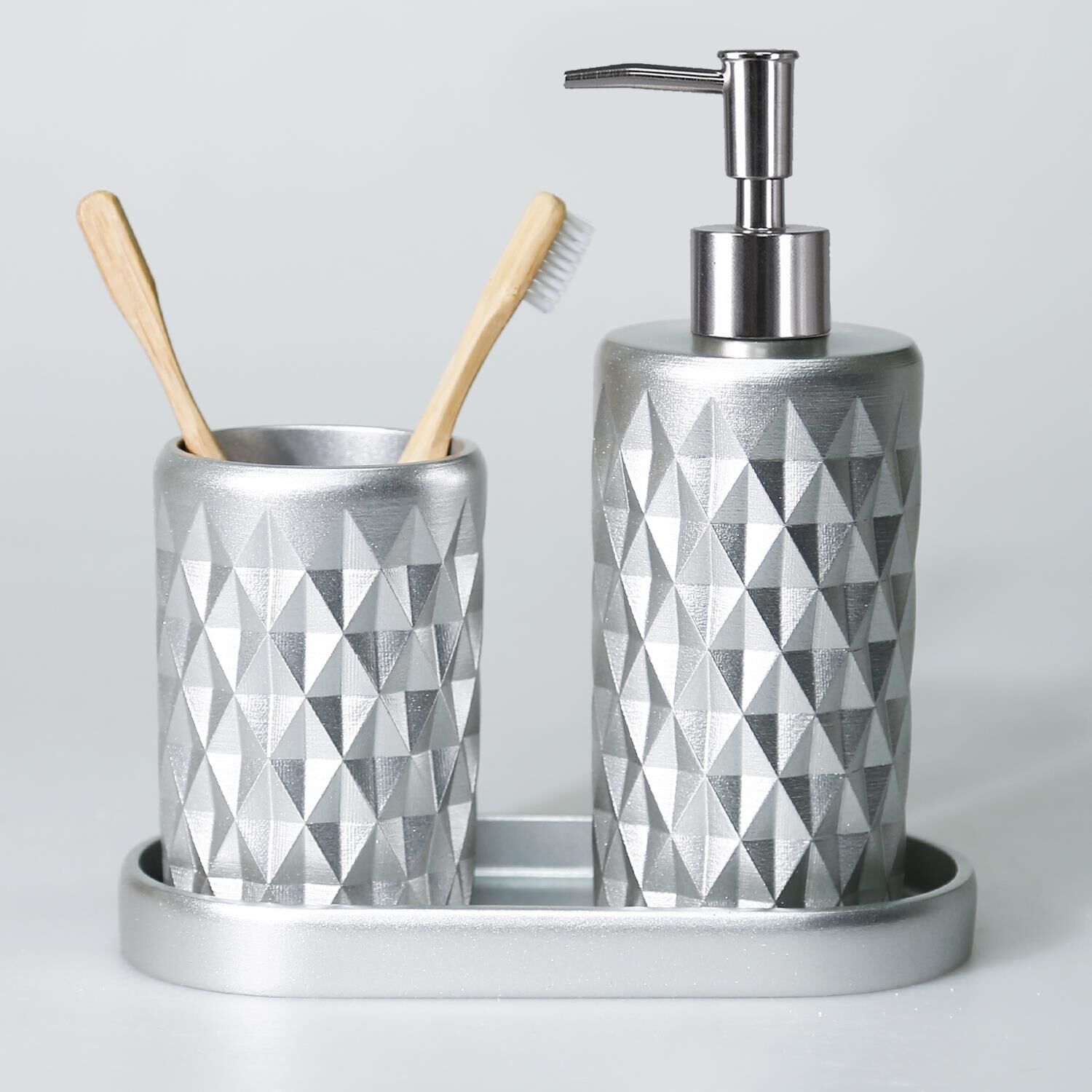 Glowing Banyo Setinin geometrik desenli yapısı, görünümünde modern ve zarif bir etki bırakır. Geniş ve ideal boyutuyla birbirinden işlevsel parçaları, banyonuzun temel unsurlarını birleştirir ve güzelleştirir. Bu setin kova kapağının özel tasarımı sayesinde atıklar temas etmeden atıldığı için kolaylık ve hijyen sağlar. Tüm parçaları titiz el işçiliğiyle üretilen bu setin tepsisine havlu, koku ve katı sabunlarınız için kullanabilir, ya da sıvı sabunluk ve diş fırçalığı koyarak lavabonuza dekoratif bir dokunuş katabilirsiniz.
