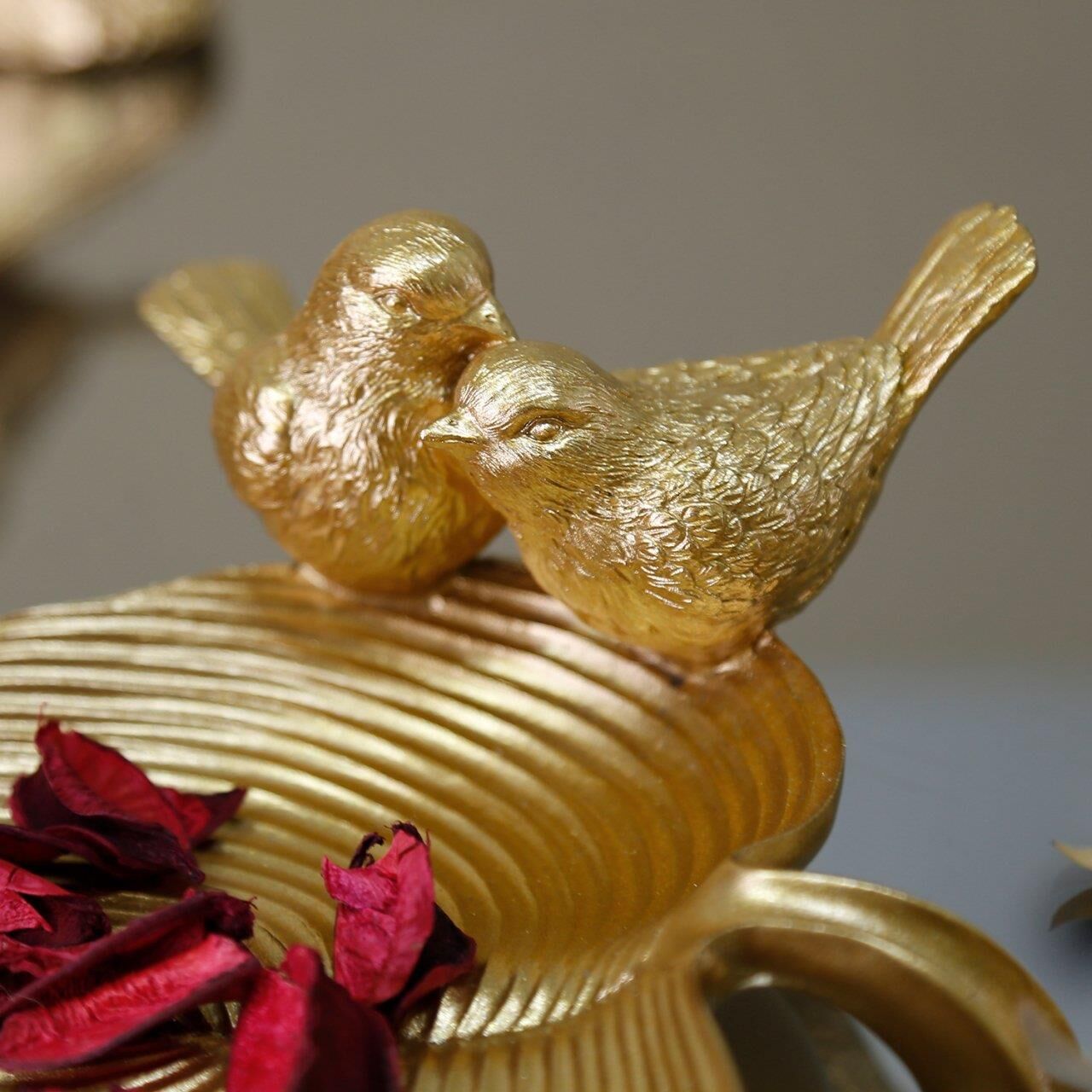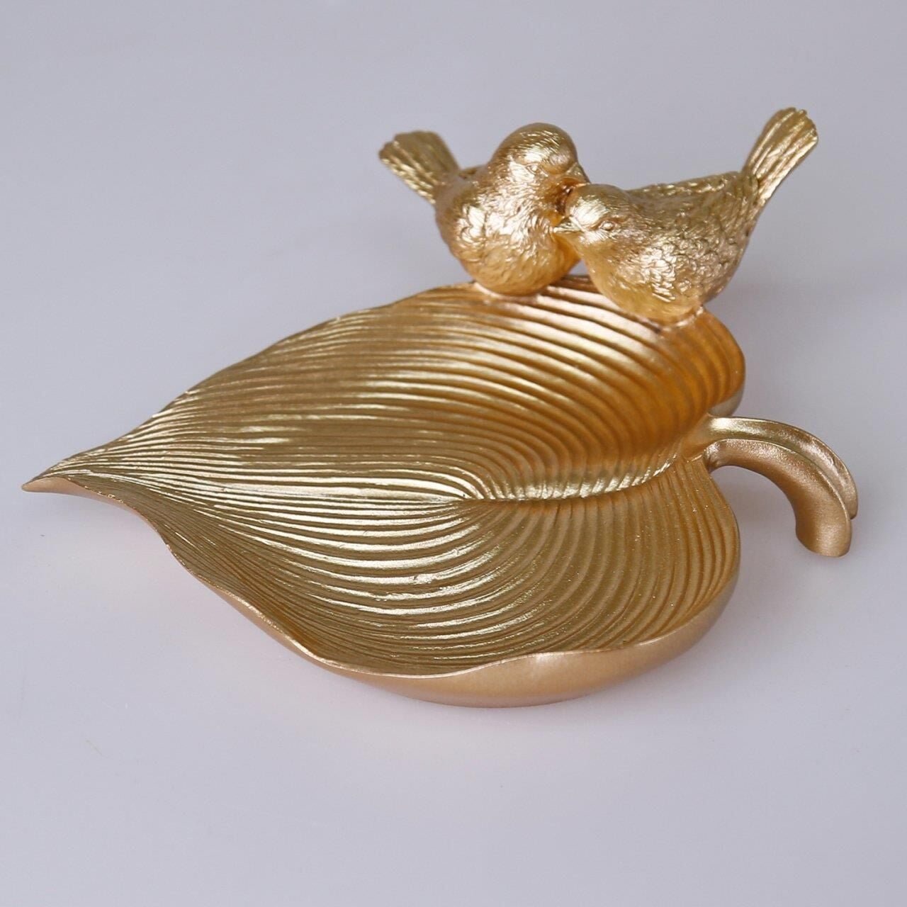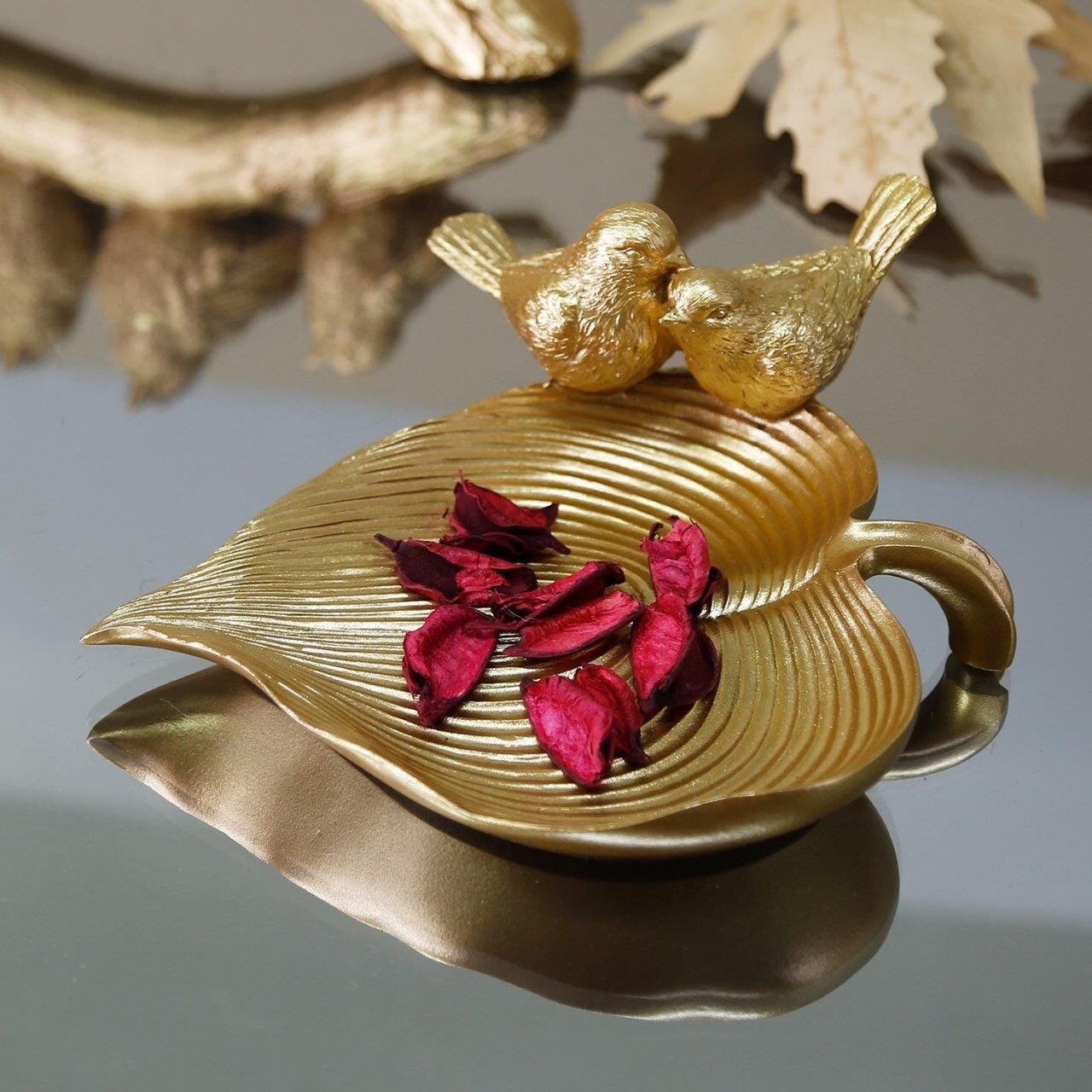 Yaprak üzerinde iki kuş figürü bulunan bu otantik dekoratif tabak ışıltılı altın rengiyle masanızda ya da orta sehpanızda çok şık duracak. İçerisine doğal parçalardan kuru dal, yaprak, meşe palamudu, kestane ve mum gibi aksesuarları ekleyerek ortamın havasını değiştirebilir, dilerseniz dekoratif dalda 4'lü kuş aksesuarımız ile de kombin yapabilirsiniz.
