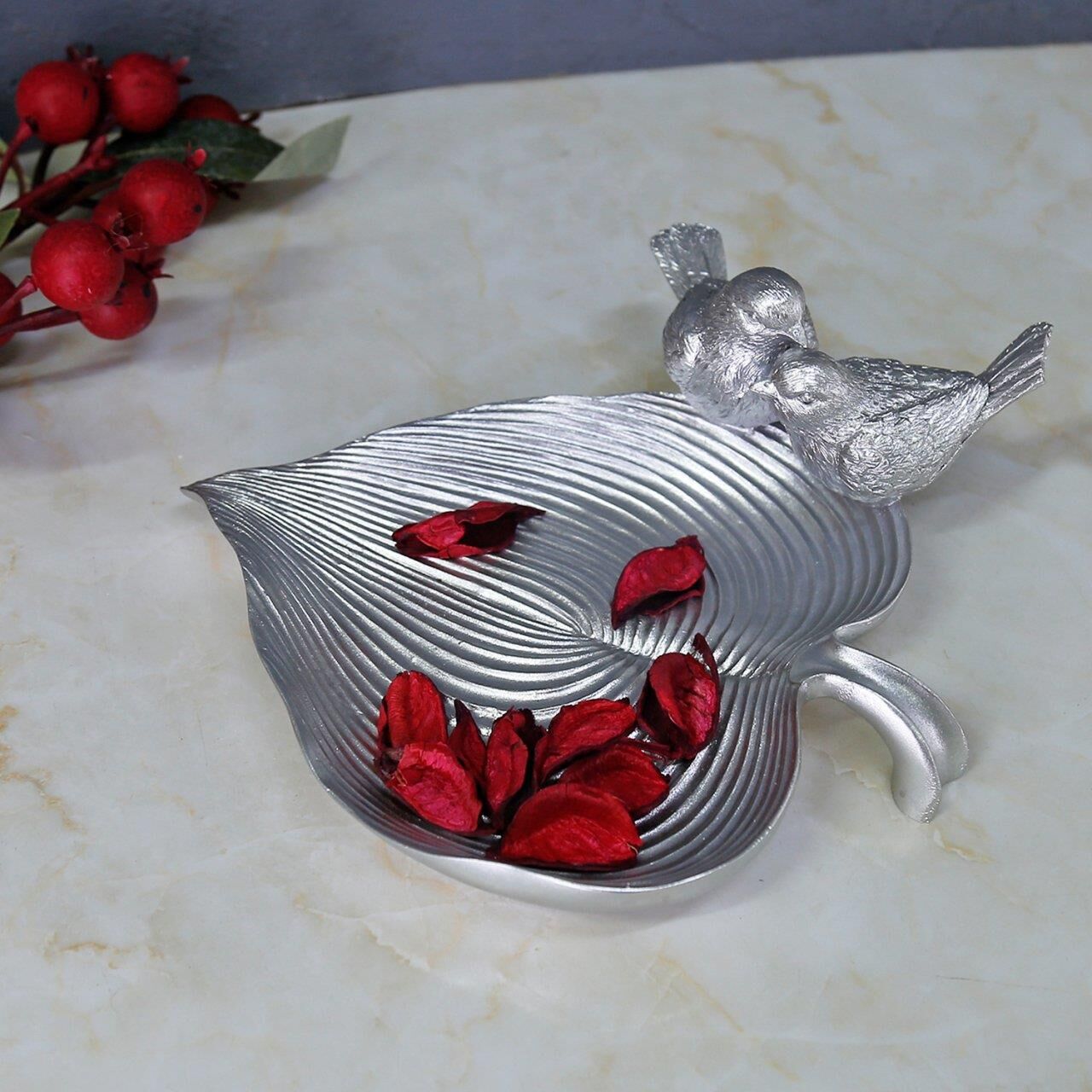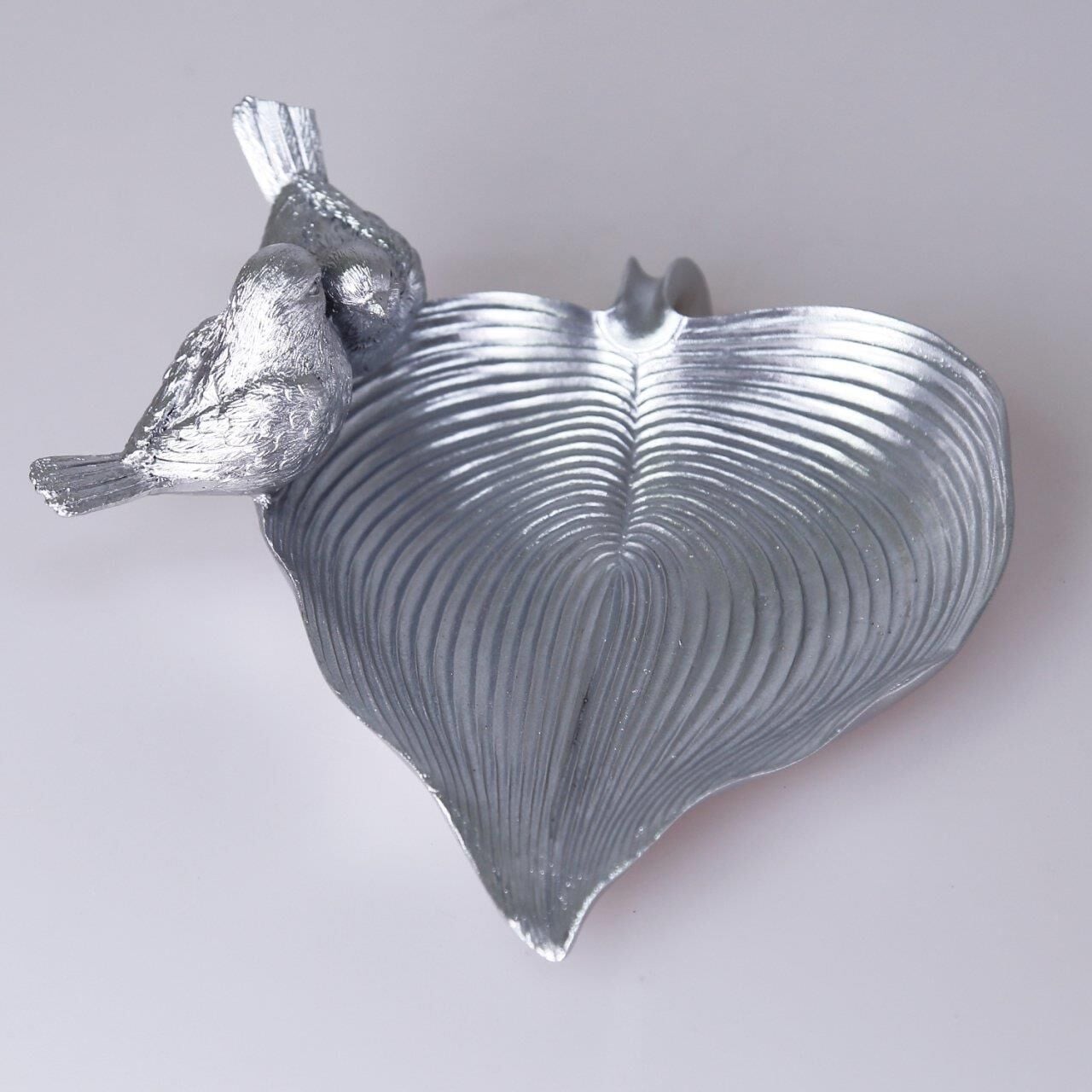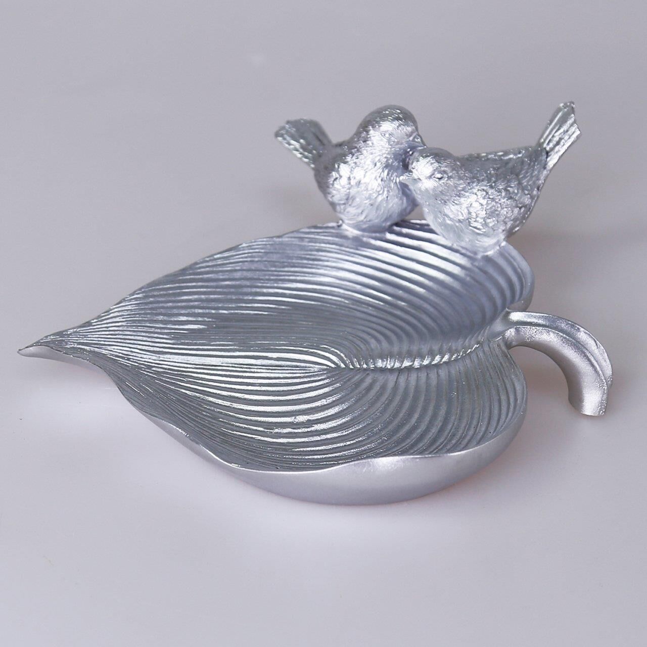 Yaprak üzerinde iki kuş figürü bulunan bu otantik dekoratif tabak parlak gümüş rengiyle masanızda ya da orta sehpanızda çok şık duracak. İçerisine doğal parçalardan kuru dal, yaprak, meşe palamudu, kestane ve mum gibi aksesuarları ekleyerek ortamın havasını değiştirebilir, dilerseniz dekoratif dalda 4'lü kuş aksesuarımız ile de kombin yapabilirsiniz.