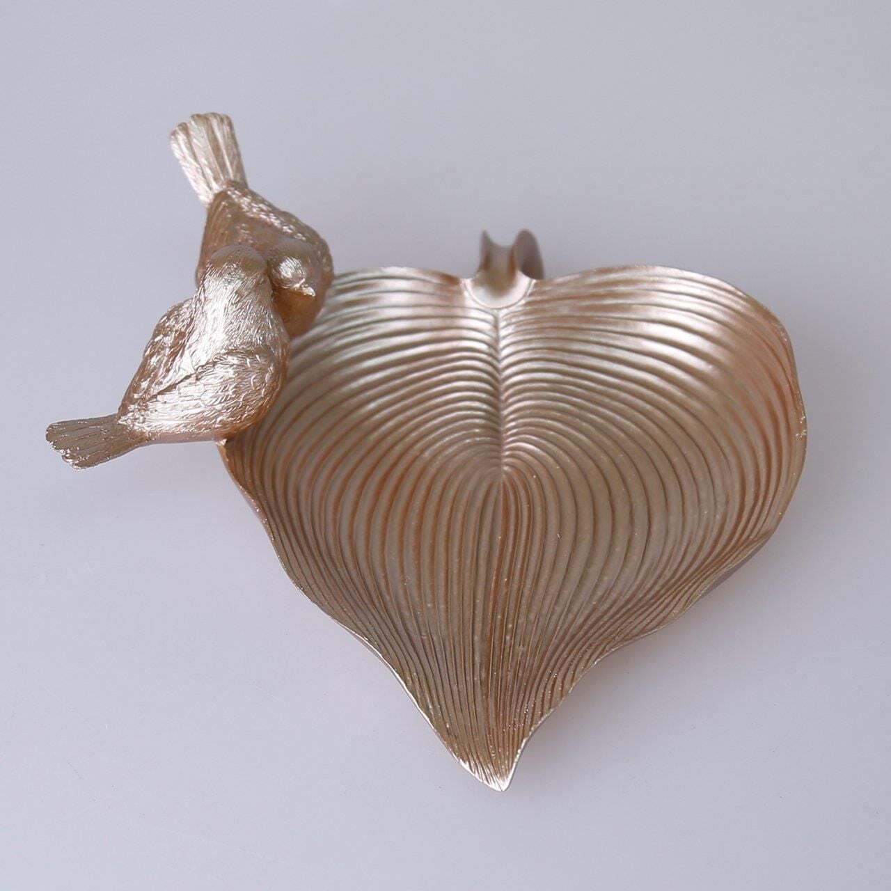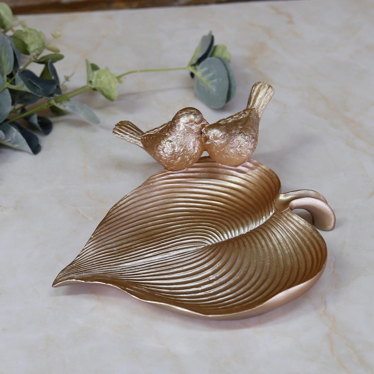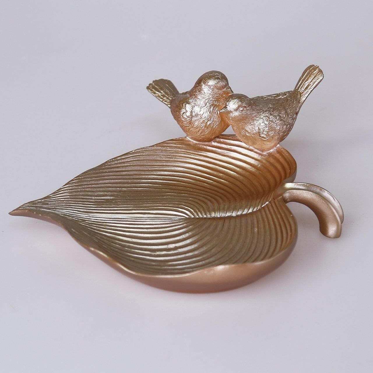 Yaprak üzerinde iki kuş figürü bulunan bu otantik dekoratif tabak çekici vizon rengiyle masanızda ya da orta sehpanızda çok şık duracak. İçerisine doğal parçalardan kuru dal, yaprak, meşe palamudu, kestane ve mum gibi aksesuarları ekleyerek ortamın havasını değiştirebilir, dilerseniz dekoratif dalda 4'lü kuş aksesuarımız ile de kombin yapabilirsiniz.