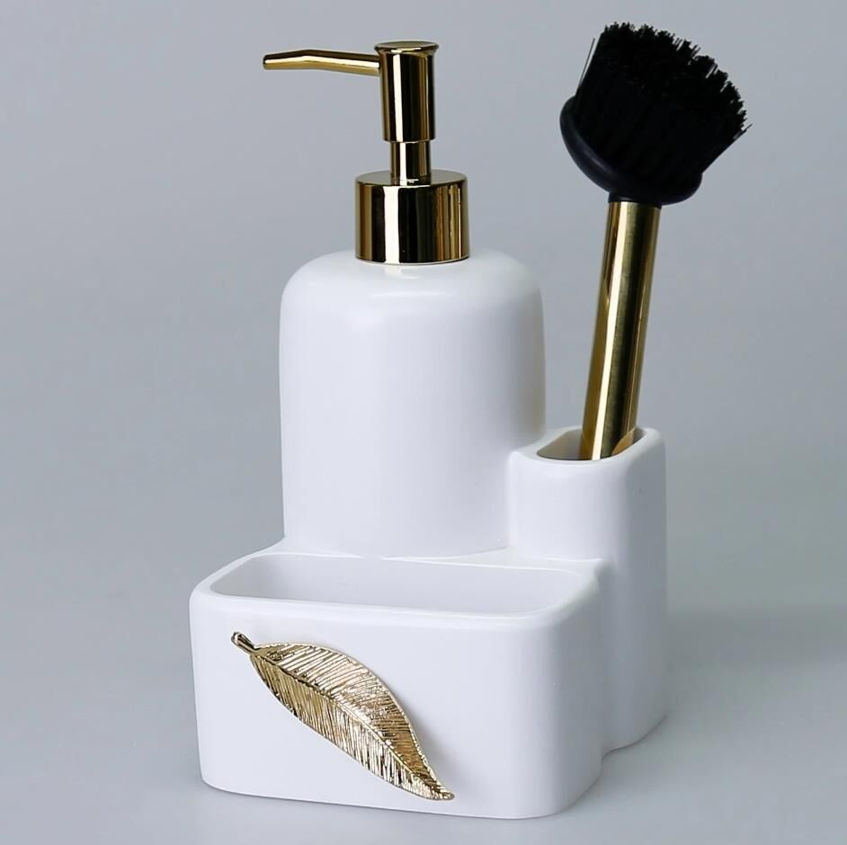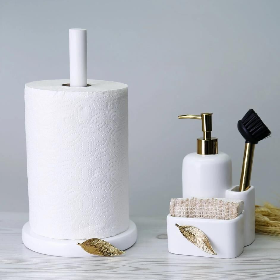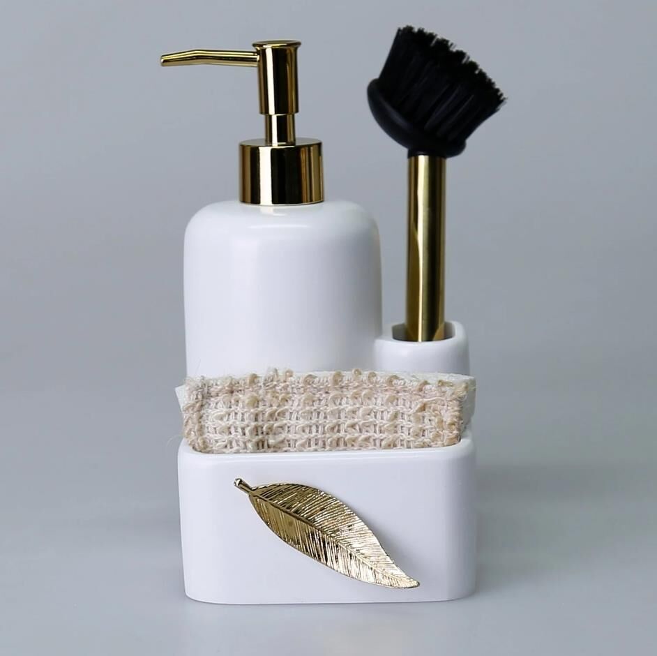 İçerisinde kendi fırçasını bulunduran Leaf fırçalı sıvılı süngerlik, geniş hacimli sıvı sabunluk tasarımı ve önündeki metalik yaprak figürü ile tezgahınızda dekoratif şıklığın yanısıra, pratik ve işlevsellik sağlar. El işçiliğiyle tasarlanan bu sıvı sabunluğu, kağıt havluluk ile birlikte satın alın.