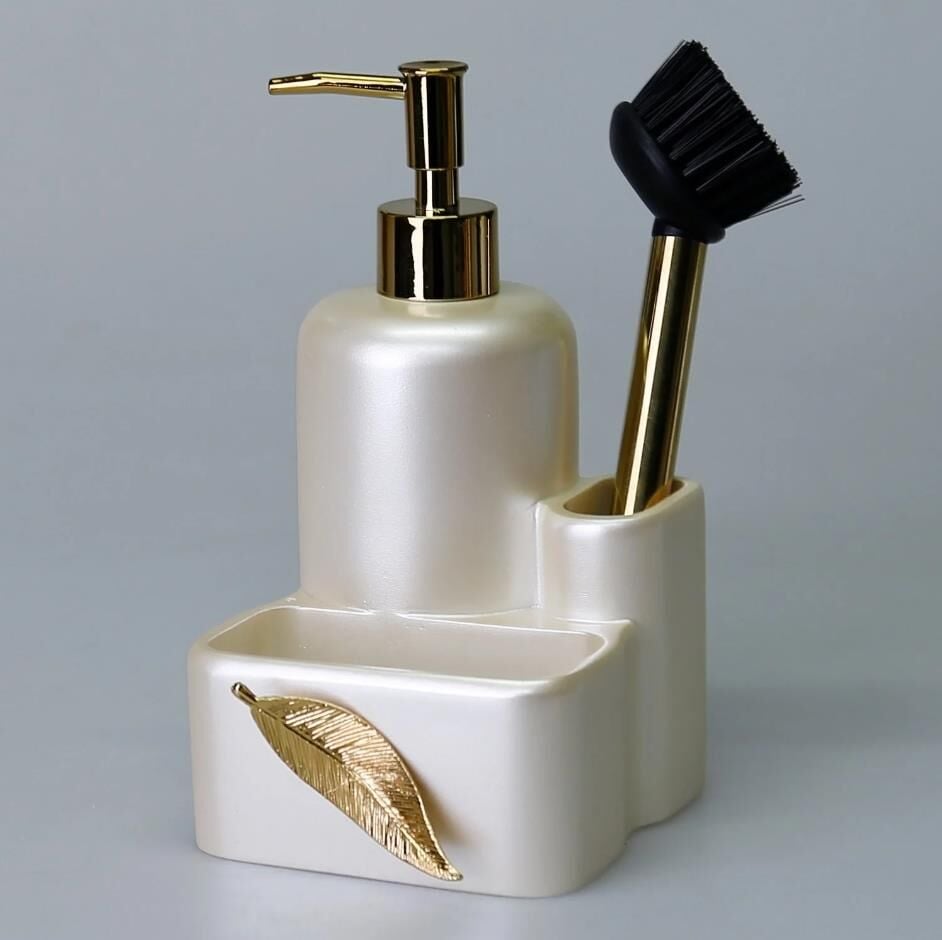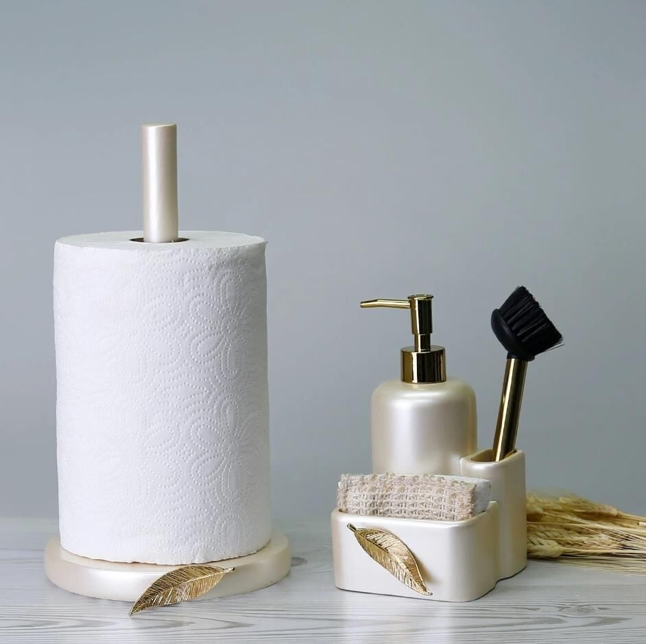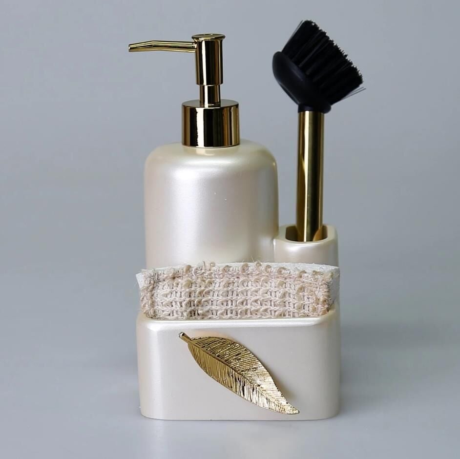 İçerisinde kendi fırçasını bulunduran Leaf fırçalı sıvılı süngerlik, geniş hacimli sıvı sabunluk tasarımı ve önündeki metalik yaprak figürü ile tezgahınızda dekoratif şıklığın yanısıra, pratik ve işlevsellik sağlar. El işçiliğiyle tasarlanan bu sıvı sabunluğu, kağıt havluluk ile birlikte satın alın.