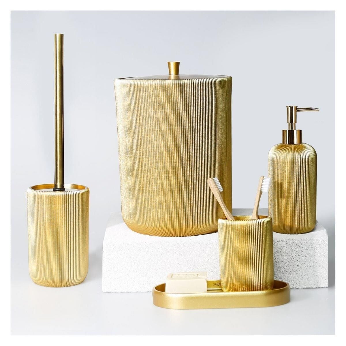 Banyonuz için şık bir set olan Lydia banyo aksesuarımız, stilinize doku katmak için hoş nervürlü detaylara sahiptir. Aralarından seçim yapabileceğiniz 6 farklı renkten altın rengi dekorunuza zengin bir görünüm katarak, banyonuzun tasarımını özelleştirir.