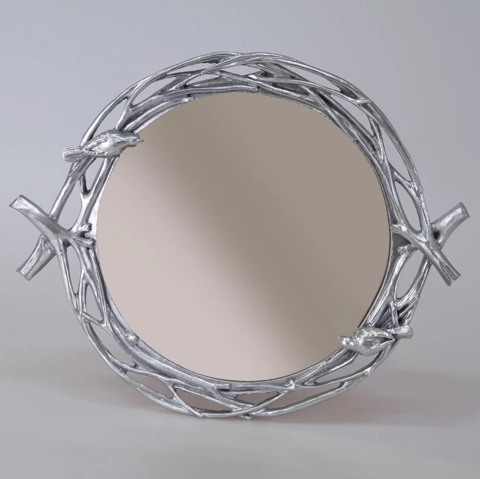 Dal şeklinde ahşap dokusu ve üzerindeki iki küçük kuş figürü ile evinizde otantik bir dekor sağlayacağınız Mavera tepsiyi, şık bronz aynası ve parlak gümüş rengiyle ister sunumlarınızda kullanın isterseniz orta sehpanızda aksesuarlarınızı sergileyin.