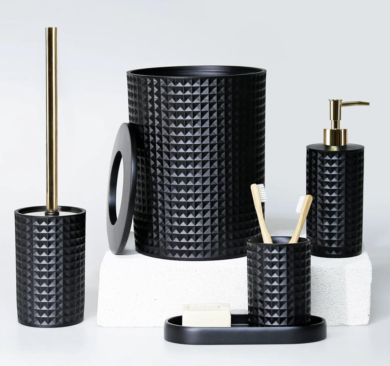Geometrik desenli yapısı ve silindir kullanışlı formu ile Neptune Banyo Seti, banyonuzun dekorasyonuna eşsiz bir deneyim katar. Geniş ve ideal boyutuyla birbirinden işlevsel parçaları, banyonuzun temel unsurlarını birleştirir ve güzelleştirir. Bu setin kova kapağının özel tasarımı sayesinde atıklar temas etmeden atıldığı için kolaylık ve hijyen sağlar. El işçiliğiyle üretilen bu setin oval tepsisini havlu, koku ve katı sabunlarınız için kullanabilir, ya da sıvı sabunluk ve diş fırçalığı koyarak lavabonuza dekoratif bir dokunuş katabilirsiniz.