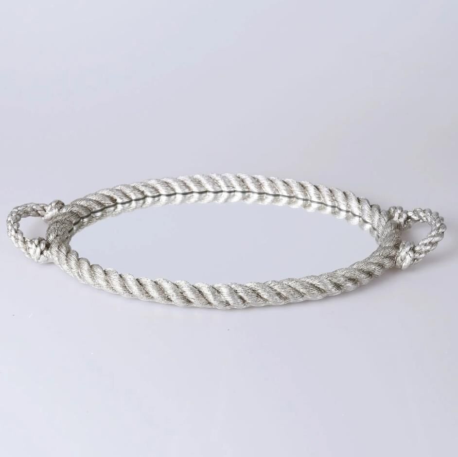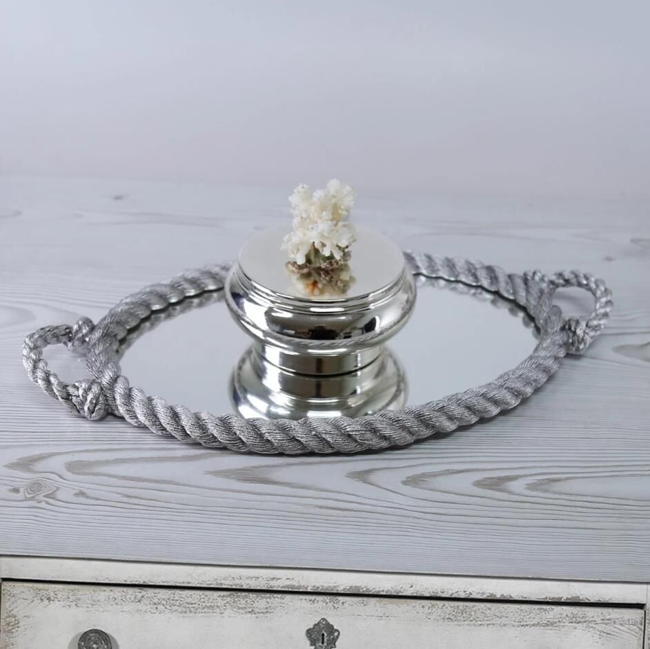 Halat görünümlü Rope aynalı tepsi, gümüş rengin parlaklığı ile evinize zerafet getirecek. Evinizde göz alıcı bir görünüm için bu oval tepsiyle, mum, çiçek ve diğer dekoratif objelerinizi sergilemek için harika bir dekor oluşturun ya da rope banyo setimizle birleştirerek konseptinizi tamamlayın.