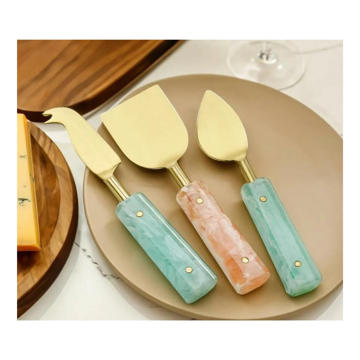 Üç parçalı set, farklı peynir türlerini kesmek, dilimlemek ve servis etmek için özel olarak tasarlanmış altın detaylı bıçaklardan oluşur.